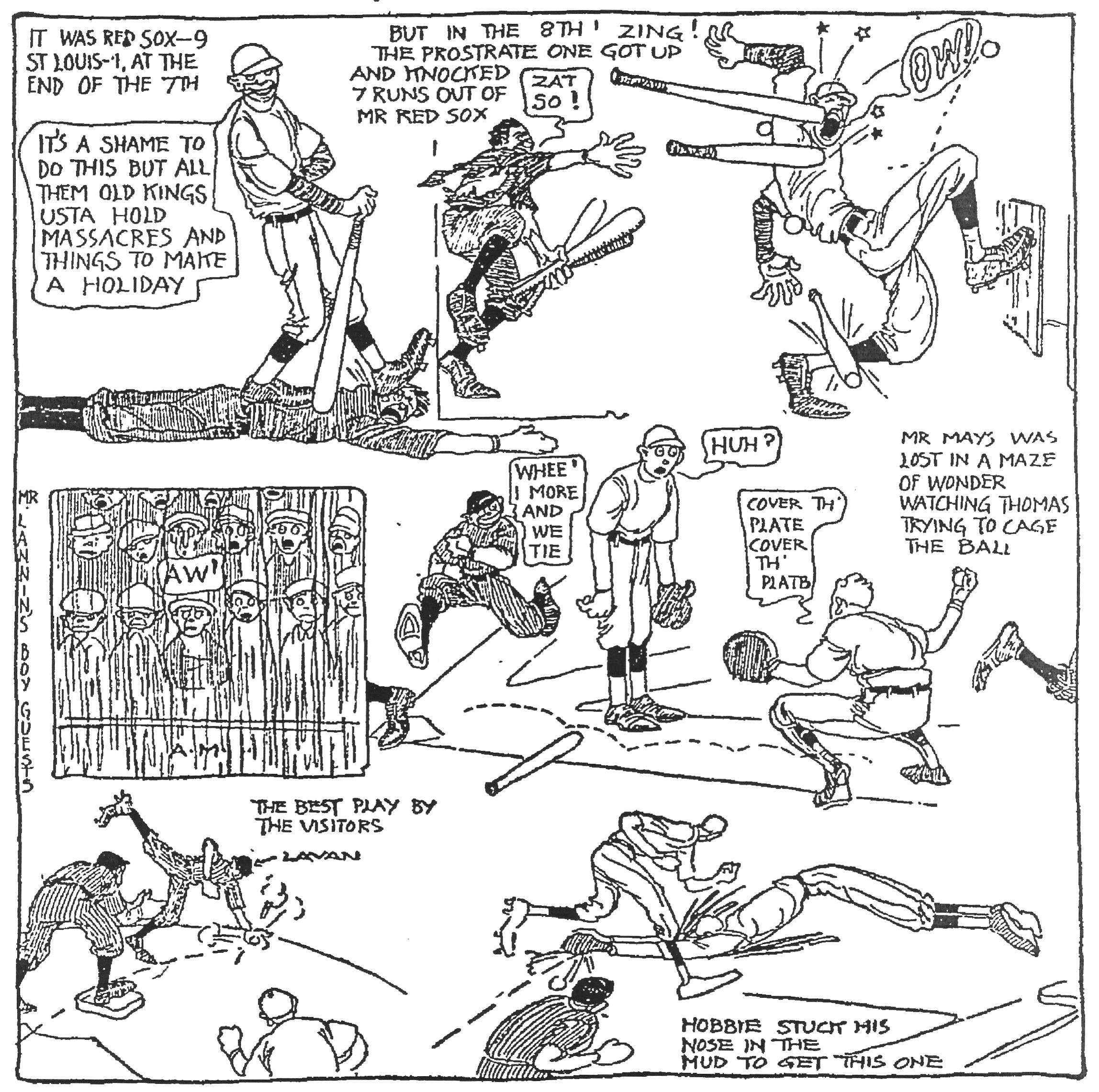WORLD CHAMPS AGAIN June 17, 1915 ... The Red Sox came out on top of the St. Louis Browns at Fenway, by a score of 11 to 10. They had scored seven runs before the Browns were able to score their first one in the top of the sixth inning. Babe Ruth was on the mound for the Red Sox and the lefty was pitching a great game until the eighth-inning, when 12 men came to bat and the Browns scored seven runs. Heavy rains prevented the morning game and the grounds were not in good condition an hour before the afternoon game was scheduled to start. But the ground crew used sawdust liberally on the base paths and around home plate and on the pitchers mound. The players were able to do fairly well, although the infield was slippery id spots and prevented the fielders from covering their usual amount of territory. The Sox batters gave a magnificent exhibition of hitting and scored two runs in each of the first five innings. Larry Gardner was the headliner, driving out base hits his first four times at bat and counting in all the runs scored. Jimmy Austin had three singles for the Browns. The Red Sox started by scoring two runs in the first inning on a pass to Heinie Wagner, a wild throw in trying to force him out of second, and a double against the left-field wall by Duffy Lewis. Then in the third inning the Sox scored another run on a triple by Gardner to right-center and a single by Pinch Thomas. Two more runs were added in the third inning on singles by Tris Speaker, Dick Hoblitzell, Hal Janvrin and Gardner. Two more runs came in the fifth on a pass to Janvrin, a single by Gardner and a base hit by Ruth, making the score 7 to 0. The Browns finally got to Ruth in the sixth inning with one out, when Bert Shotton drew a pass and went to third on a single by Jimmy Austin. He scored on Whitey Pratt's ground ball to Heinie Wagner. In the seventh inning the Red Sox got another pair of runs on a pass to Janvrin, a single by Gardner and a line drive by Ruth. But then the trouble started. In the seventh Ruth's velocity slowed and he was also having trouble getting the ball over the plate. Shotton started off with a walk and Austin hit the ball to the left bank. Pratt singled, Walker walked and John Leary singled. With the bases loaded, Doc Lavan cleared the bases with a screeching line drive to the bank in left-center, later scoring on a sacrifice fly by Hank Severeid. Carl Mays came in to relieve Ruth and was met by Harry Hoch lining a base hit. Mays walked Shotton and Austin sent home the seventh run with a single to left, cutting the Boston lead down to one run, 9 to 8. In the bottom of the inning however, with one out, Speaker reached first on a wild throw and then stole second. Lewis drew a pass and the two of them worked a double steal. With runners on second and third Janvrin came across with a single to center to score both of them putting the Sox up by three, 11 to 8. In the ninth-inning Walker opened with a smashing single through short for the Browns and Walsh drove another hit to left. After Leary was thrown out at first, Lavan topped the ball in front of the plate. Both Mays and Pinch Thomas went after it. Thomas picked it up but dropped it. Mays failed to cover the the plate and both Walker and Walsh came home. Now the Sox lead was just one run. But Mays got Hank Severeid on a ground ball, and Gus Williams to hit a weak grounder to Hoblitzell to end the game. Babe Ruth struck out 10 men, yet gave up five earned runs in the eighth-inning alone, after getting one out. Heinie Wagner gave way to Bill Rodgers after five innings and the young kid look good in the field. The Red Sox have now won 15 of their last 19 game. The game postponed in the morning will be played as a doubleheader when St. Louis comes here on their next road trip. |