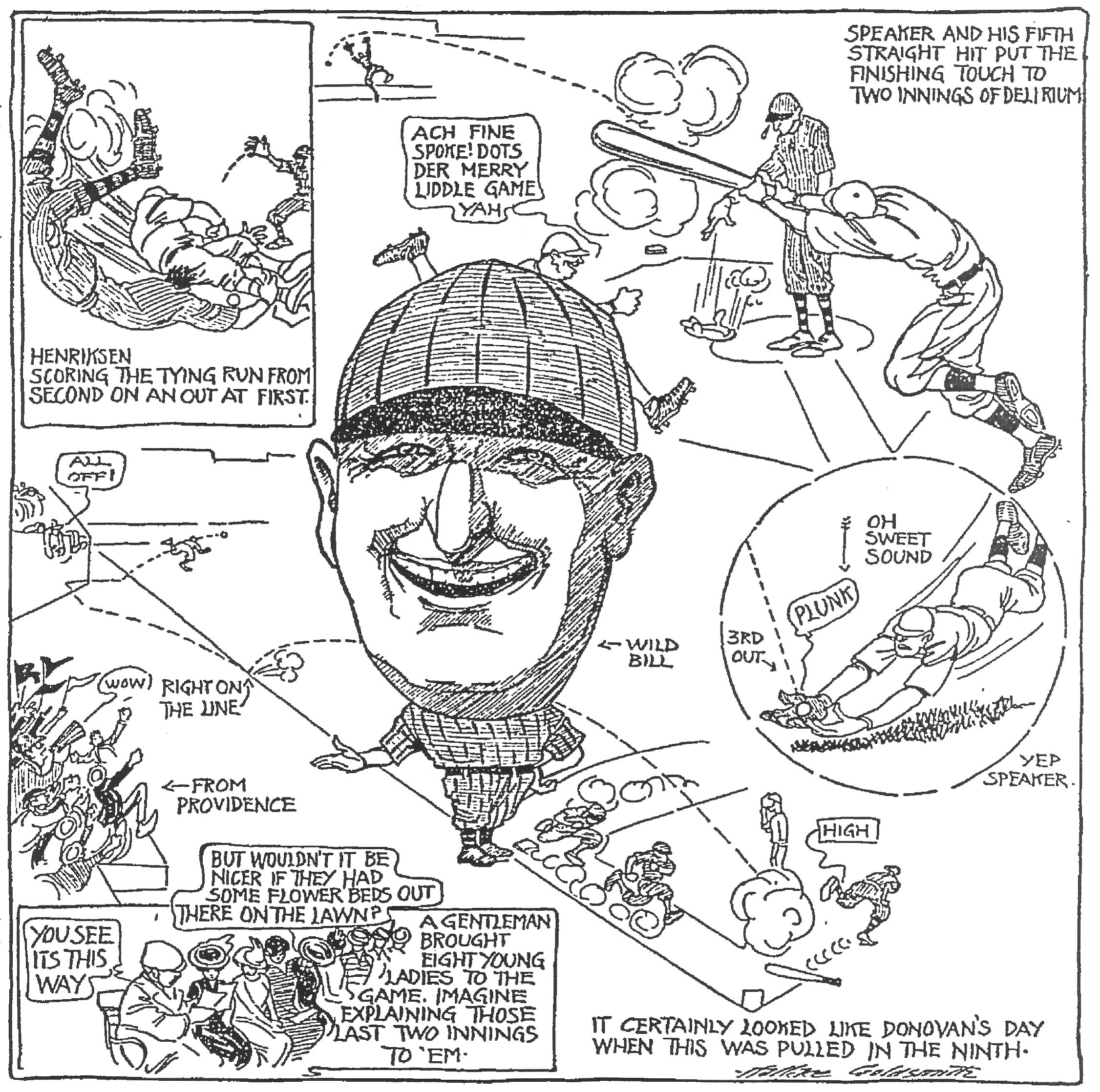 came charging in with Janvrin and Wagner going out. Speaker dove and caught the ball, out straight on his stomach to end the inning.