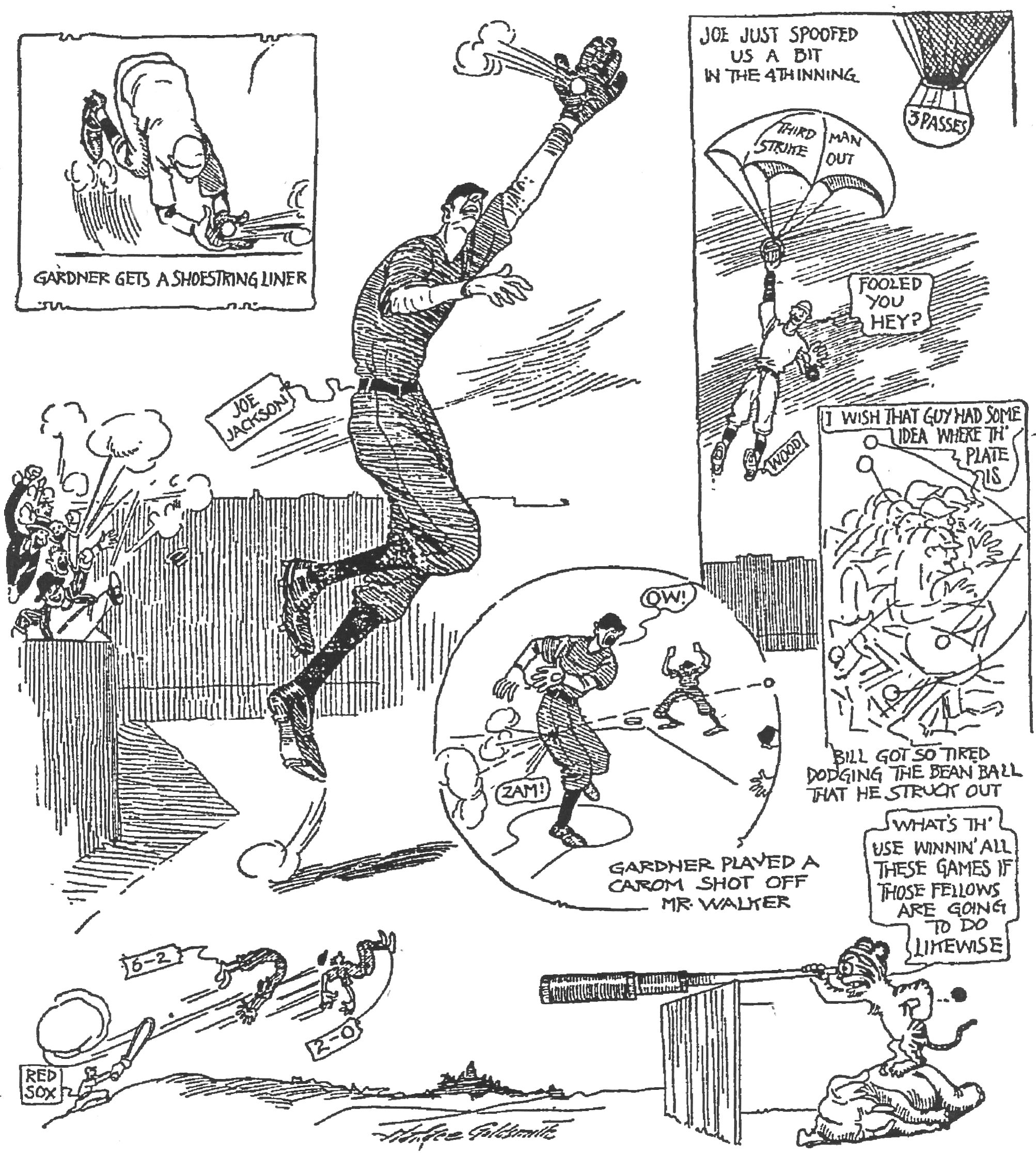 the sixth he struck out all three batters. The only hit was by Bill Wambsganss on a ground ball to Hal Janvrin, that just simply got by him in the eighth inning. In seven of the nine innings he retired the Indians in order. Guy Morton pitched well for Cleveland,
