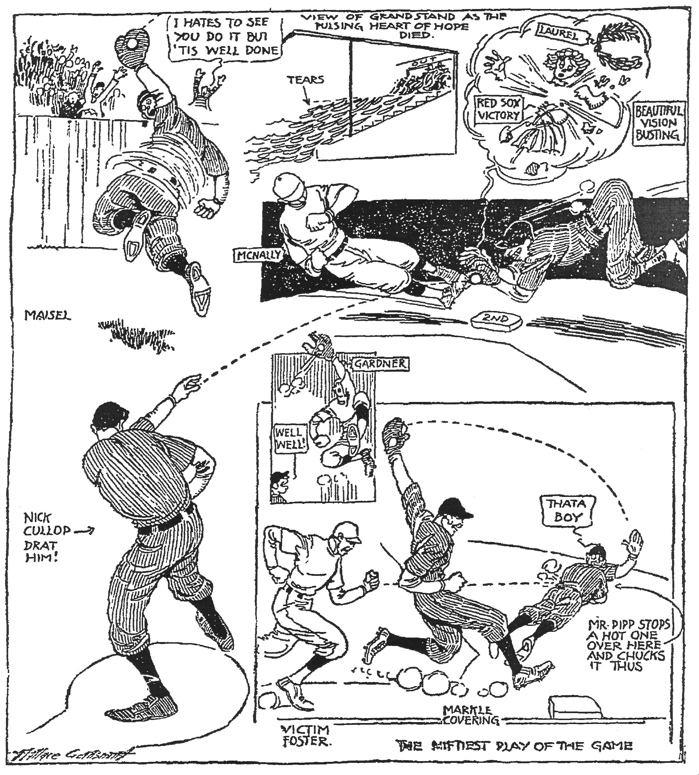 first and Barry on third. Hooper hit the ball to Frank Baker at third who went home and nipped Jack Barry for the second out, with McNally getting to second. Then before Hal Janvrin could even get a chance to bat, Cullop turned and threw the ball to Joe Gedeon at second base to