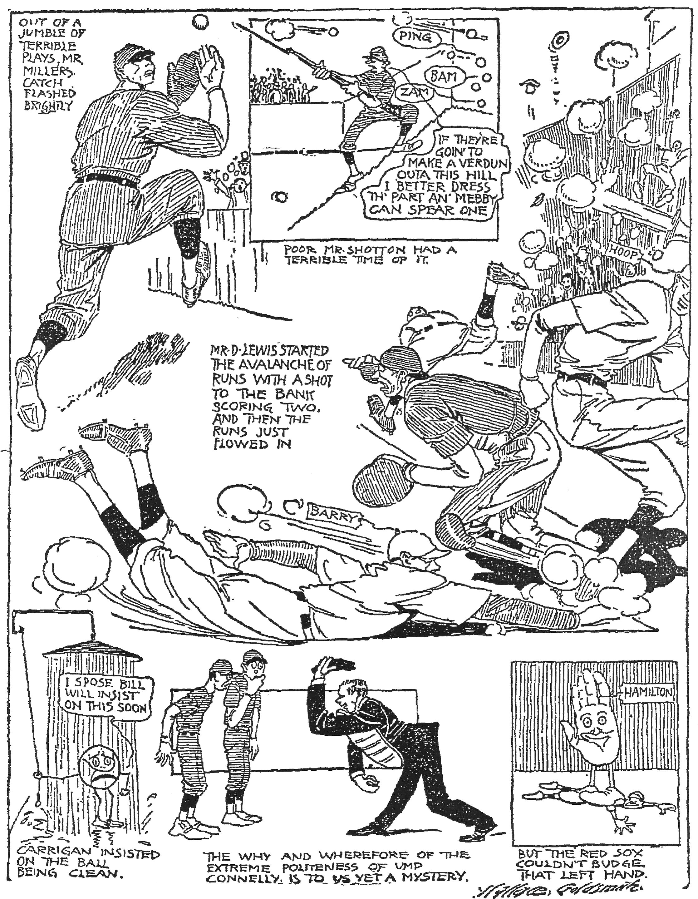 Sox batters couldn't make any headway against Hamilton until late in the game. The Sox had men on second and third, with two outs, in each of the last two innings and couldn't get the hit to drive in. In the eight Hal Janvring grounded out and in the ninth Jack Barry hit a fly