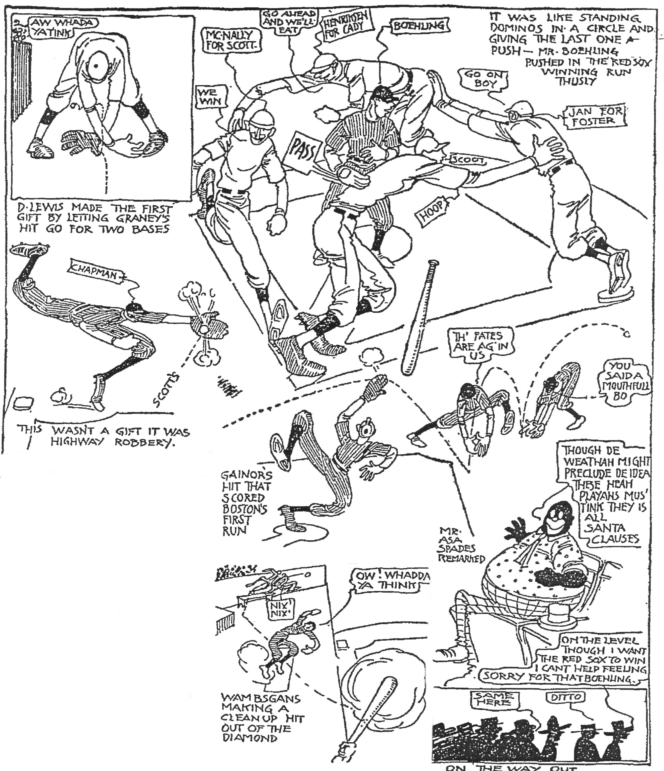 Gardner tagged out at third, Hick Cady smashed a ball into center, sending Scott to third. Hal Janvrin, hitting for