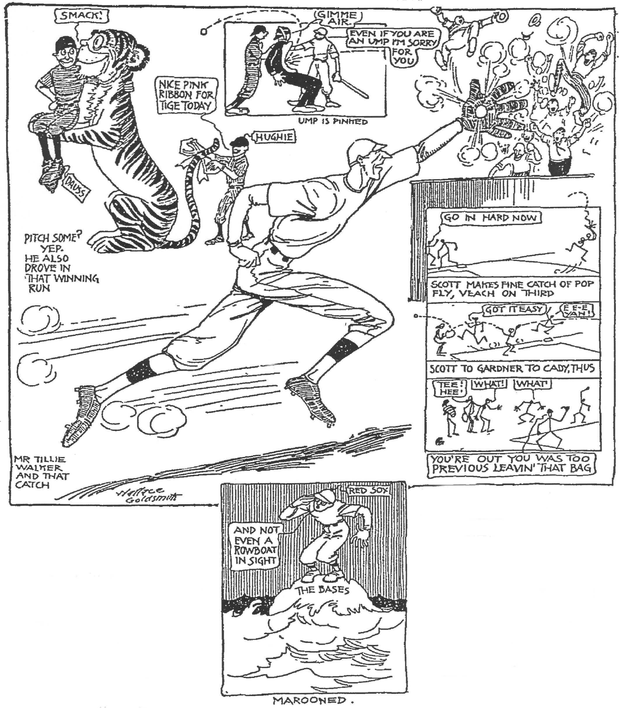 The Tigers out-pointed the Red Sox by a score of 2 to 1. The fielding was clean and sharp, with the Tigers getting the best breaks. Ernie Shore pitched nicely for five innings, then was hit for two singles and three doubles in the sixth and seventh