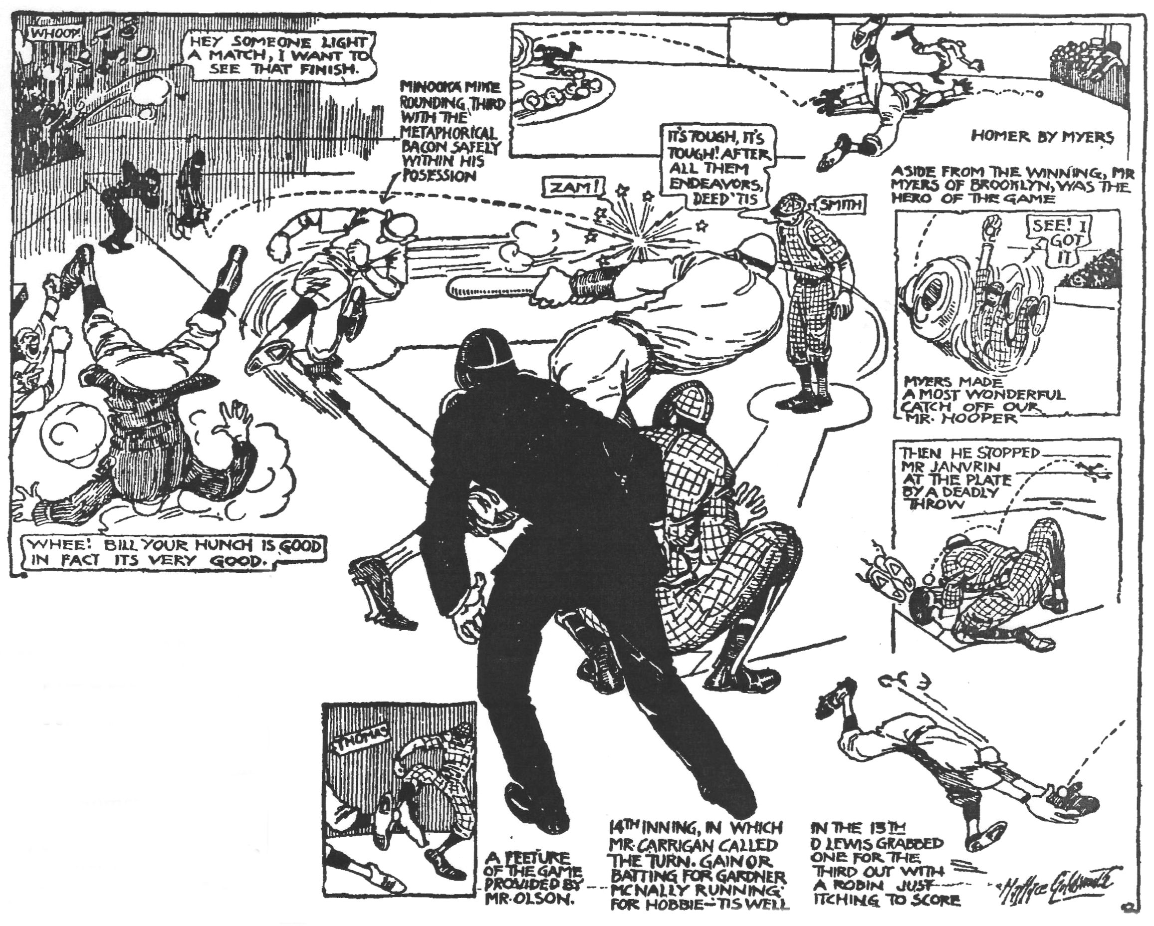saving the day for his team in the ninth inning, when it looked like it was all over. Zack Wheat started by dropping Hal Janvrin's drive in left filed, allowing him to get on second base. Myers then made a great throw to the plate after taking a line drive from Dick Hoblitzell and
