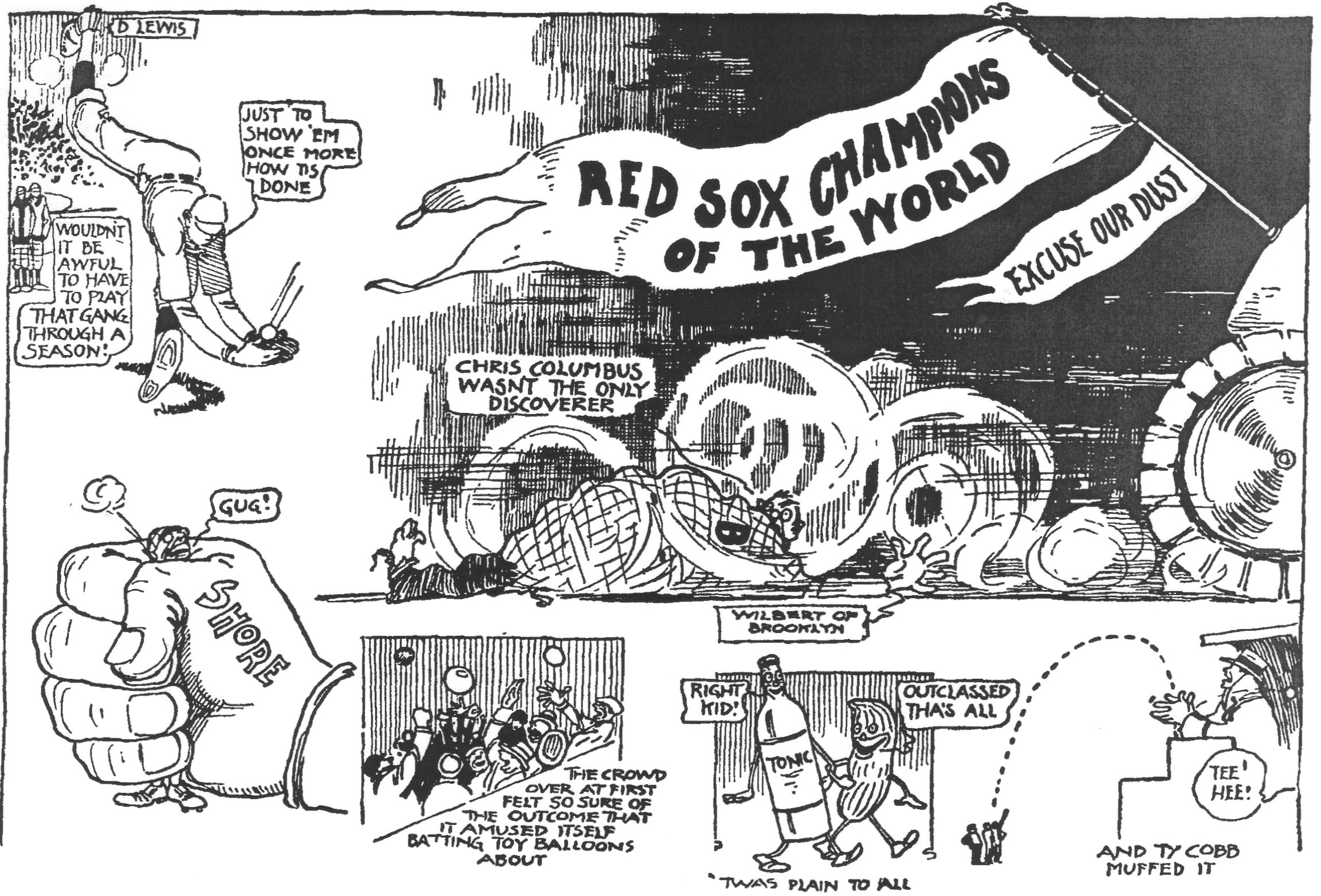than a baseball game with a strong east wind blowing. The Red Sox played great baseball in every game, made no blunders and showed their best all-around game yesterday in their crowning performance. Duffy Lewis, Larry Gardner and Ernie Shore carried off the honors for this one.