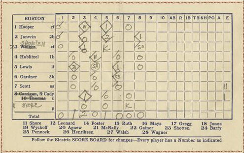 the threat was over. Ernie Shore was magnificent allowing only two legitimate hits in nine innings and walked only one man. The only run Brooklyn scored was the result of a passed ball. The Robin's Jeff Pfeffer received moth eaten support. Wretched fielding by Zack