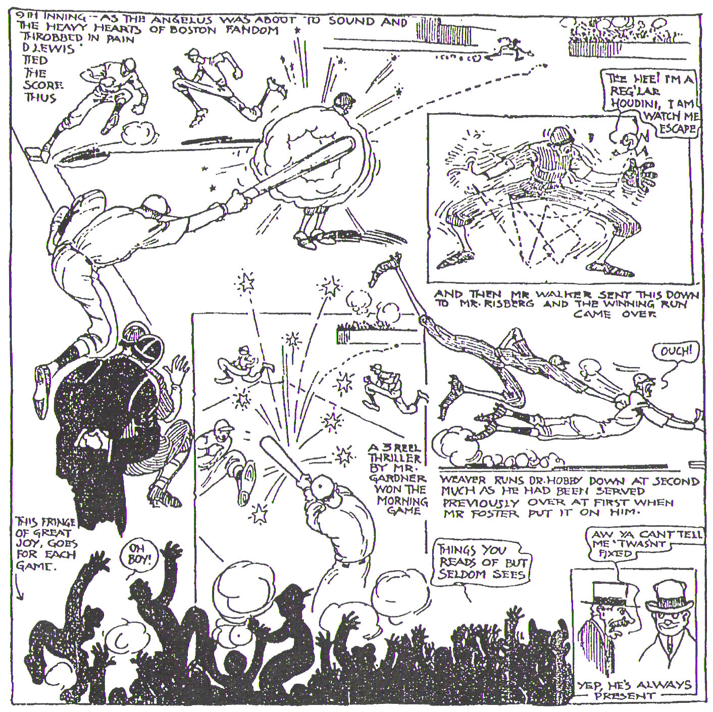 WITH HARRY FRAZEE ... June 18, 1917 ... By turning loose their bats loose at key moments, the World Champions won two great ball games from the Chicago White Sox today. More than 24,000 fans witnessed the combat. The scores were 6 to 4 and 8 to 7, the Red Sox taking the afternoon game in the last inning when they chalked up four runs. Larry Gardner made the big noise in the morning with a triple that he unleashed in the seventh inning with the bases filled, snatching what looked like a certain victory away from Chicago. As great as the morning finish was, it failed to compare with the thrilling windup of the afternoon, when the Red Sox pulled the iron out of the fire in the ninth inning because of errors by Swede Risberg and Eddie Collins, accompanied by hits off the bats of Harry Hooper, Duffy Lewis, and Tilly Walker. It was a fine hit from Lewis who drove in the tying run and by Walker to the inexperienced Risberg who missed it, that put over the decisive tally. The morning contest was a battle of strategy, the jockeying of pinch hitters and of pitchers. Carl Mays pitched for the Red Sox and got away poorly giving Chicago a 3-0 lead in the second inning. He steadied however holding the White Sox to just one hit in the last four innings. n the meantime the Red Sox faced Reb Russell who lasted until they put over two runs in the fourth inning. A single by Larry Gardner, a triple by Tilly Walker, and a sacrifice fly from Everett Scott gave the Red Sox a pair of runs to make the score 3-2. Dave Danforth followed and his failure to get the ball anywhere near the plate in the seventh inning, brought about his removal. After Sam Agnew walked, Mike McNally ran for him, and scurried to second when Collins threw out Mays. Harry Hooper then drew an intentional pass and with the count two and nothing on Jack Barry. Eddie Cicotte stepped in to pitch. Barry then took a seat and had Chick Shorten replace himself. Cicotte walked him to load the bases. Del Gainer was then pulled out of game by the Red Sox skipper who replaced him with the left-handed hitting Dick Hoblitzell. So manager White Sox manager Rowland brought in Lefty Williams to fave Hobby. Barry countered with right handed batter, Hal Janvrin. Janvrin knocked a ball down to Risberg who threw out McNally at the plate. Larry Gardner then cleared the bases with a triple to take the lead. He was followed by Duffy Lewis, who drove him in with an insurance run, to make it 6-4. Mays held the lead by getting the White Sox out in the eighth and ninth innings and giving the Red Sox the come-from-behind win. Larry Gardner not only won the morning game with his bat is cut off to White Sox runs in the fifth inning when he made a jumping catch and plucked a liner from Eddie Collins. Dutch Leonard was supposed to pitch the afternoon game, but hurt his foot during morning batting practice, so manager Jack Barry selected Rube Foster to take the mound. The White Sox scored one run, and could have had two, except that Risberg left third-base early before Duffy Lewis had snared Jim Scott's fly ball in the second inning. They scored two more in the fourth inning and two more in the fifth inning on two base hits, an error, a hit batsman and a wild pitch to give themselves a 5 to 0 lead. That finished Foster and he gave way to Herb Pennock. In the bottom of the fifth the Red Sox got busy on doubles by Everett Scott and Pinch Thomas, a single by Harry Hooper and Shorten 's infield out to notch two runs. Two more runs were earned in the sixth inning on a single by Duffy Lewis, a double by Tilly Walker and Chick Gandil 's fumble of a ground ball from Thomas. Pennock helped himself with a Texas leaguer to center field and the lead was cut to 5 to 4. Two singles and a triple by Swede Risberg gave the White Sox a 7 to 4 advantage in the seventh inning. The Red Sox went down in the seventh and eighth, but Pennock led off in the ninth and reach first on a fumble by Collins. Harry Hooper singled and the bases were filled when Risberg booted Janvrin's ground ball. Hobby then hit a grounder down to Gandil at first base and he elected get Hobby rather than Pennock at the plate. That made the score 7 to 5 and brought up Duffy Lewis who hit a smash to center field that scored both Harry Hooper and Janvrin to tie up the game. He took second base on the throw in, took third on a passed ball and came in to score the winning run when Risberg failed again to gather in another ground ball, this one off the bat of Tilly Walker. Final score was a gift of 8 to 7. |