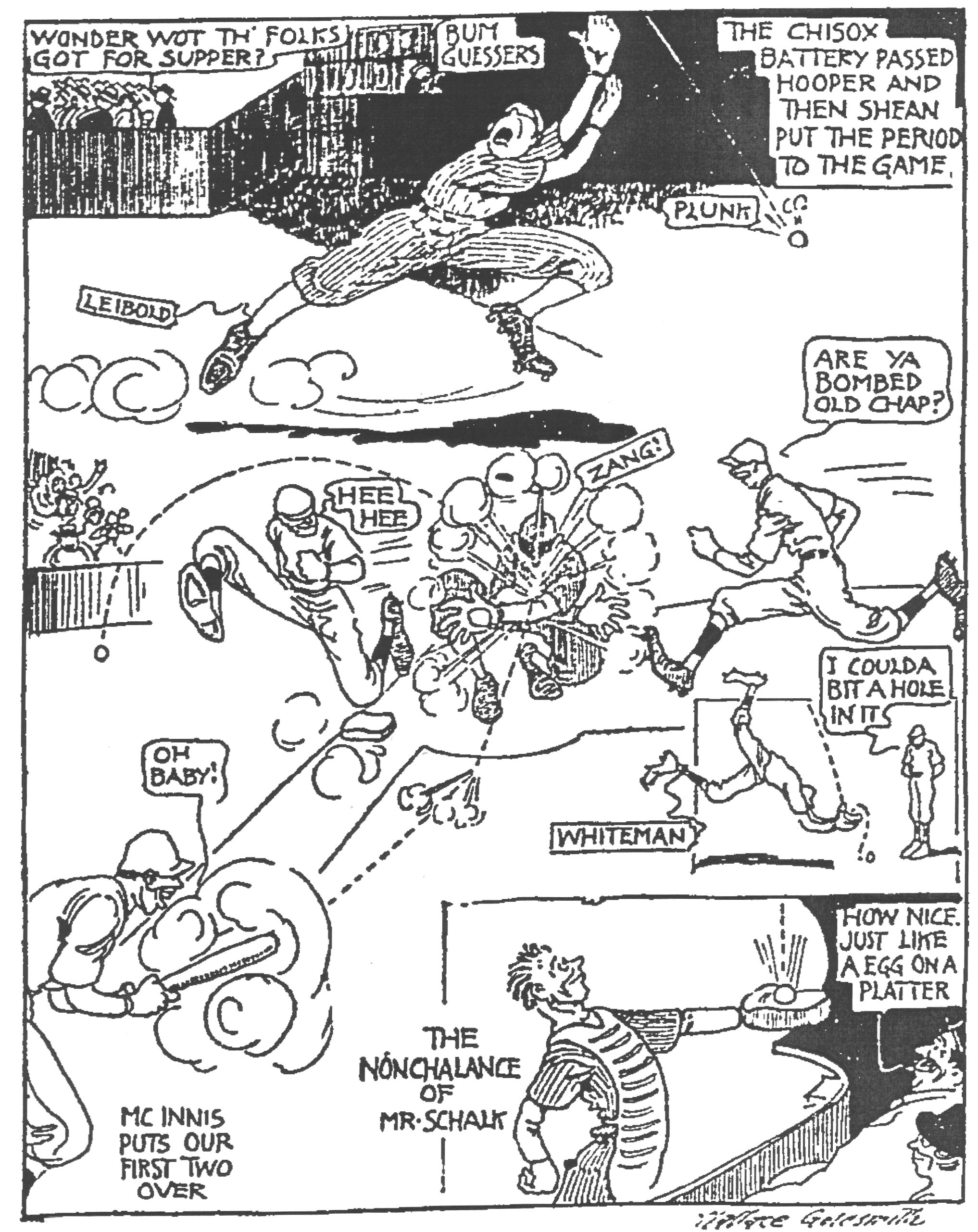 Thereafter, however, Whiteman shown conspicuously. In the fourth, he plucked a hit from Shano Collins and doubled Happy Felsch before he could return to second base. In the seventh he made a great running catch off Ray Schalk when the White Sox had the bases jammed. And