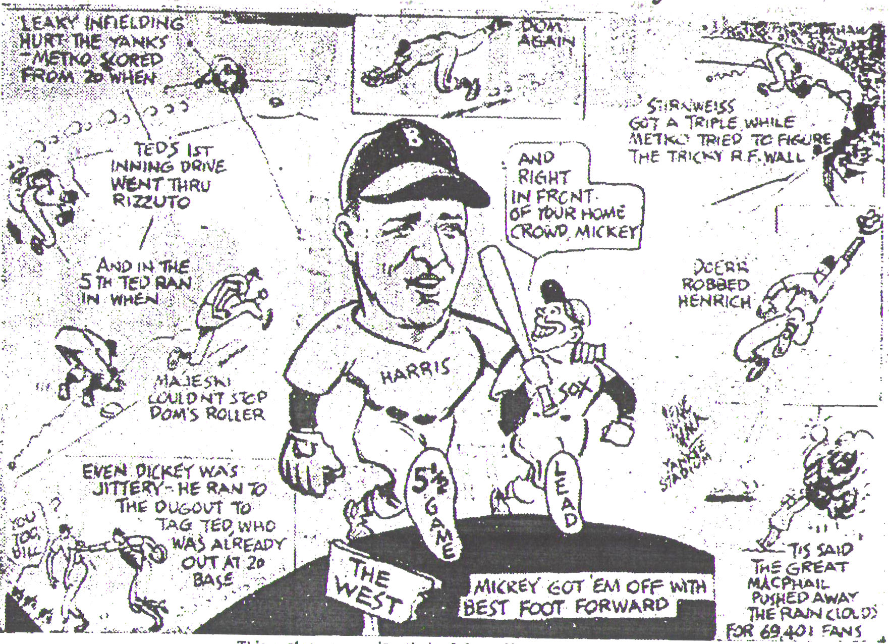 The Yankees were more generous in the fifth, when they allowed the Sox to score twice. George Metkovich walked to start the inning and went to third on a wild pitch. Bobby Doerr bounced a high chopper that allowed Metkovich to scamper home. Ted Williams, who was also on base, made it