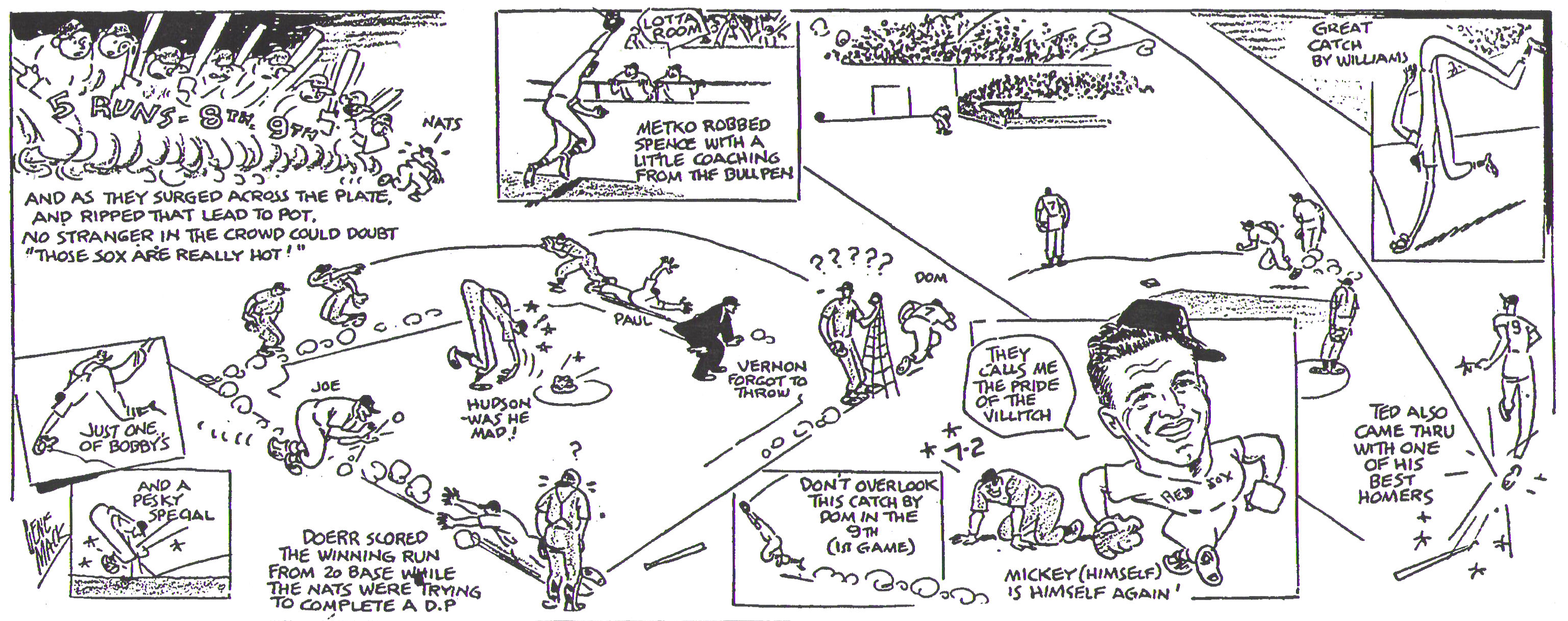 What little hope Washington retained, was completely buried by the defensive of play of Doerr and Williams in the sixth inning of the aftermath. The Sox entered with a 5 to 2 lead and Ted had just belted a homer half a dozen rows up into the centerfield seats above the 420 foot sign. Mickey