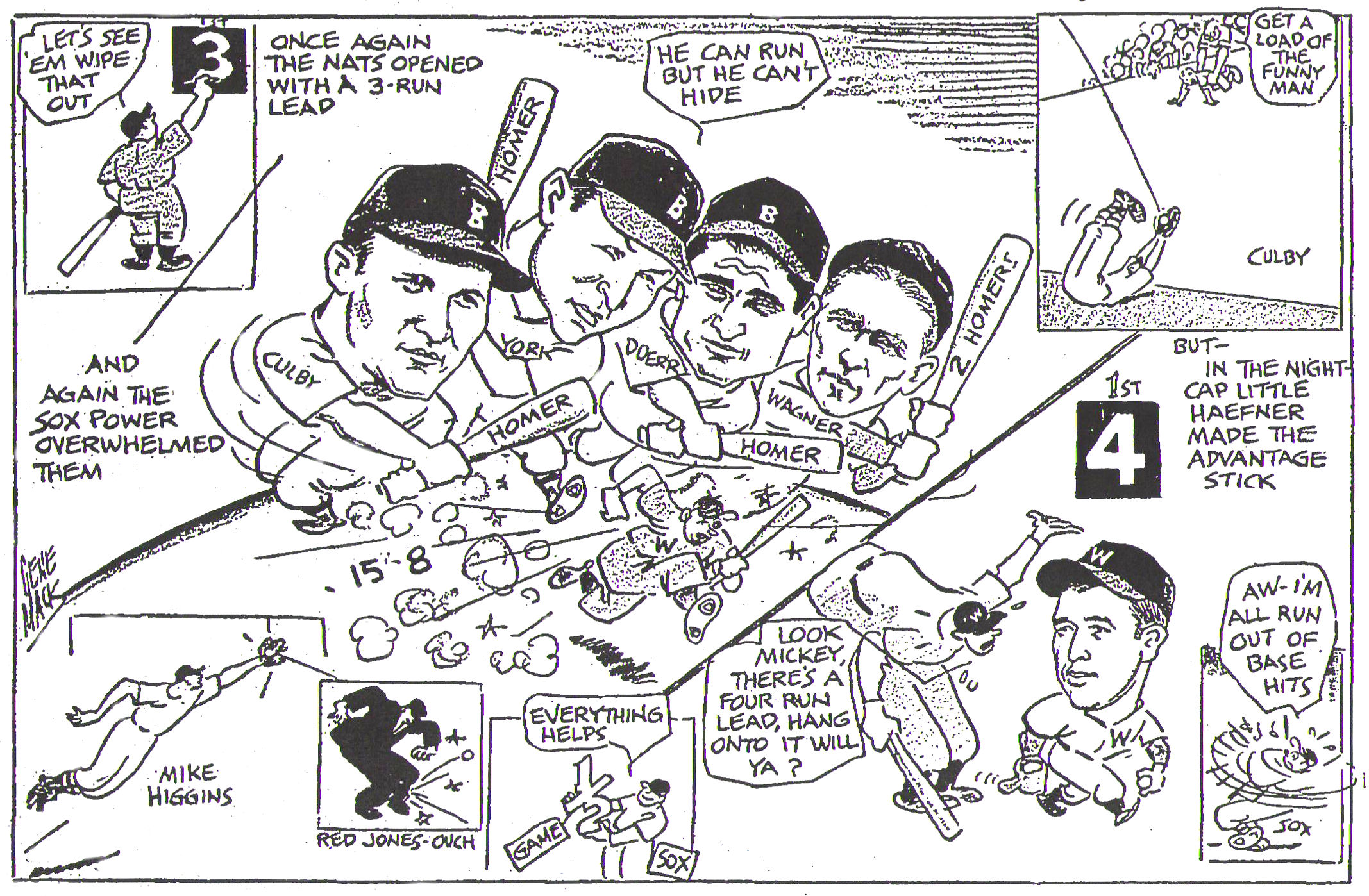 Bobby Doerr, Lee Culberson, and Hal Wagner led the Sox to their third straight double digit beating of Washington. The game was in the bag after the first inning, in which the Sox scored eight times for their single biggest inning of the season. Dave Ferriss coasted to his 12th victory