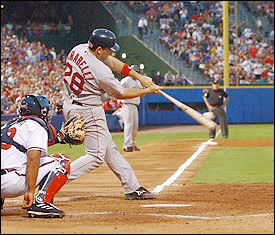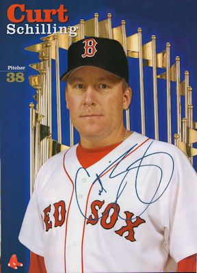 THE "IDIOTS" REVERSE THE CURSE July 3, 2004 ... Curt Schilling stopped the Red Sox slide by going the distance and shackling the Braves, 6-1, before a record crowd of 51,831 at Turner Field. Schilling was the impresario of the revival festival. Providing crucial relief for the overtaxed Sox relievers, he pitched his second complete game of the season, scattering six hits and a walk in allowing the lone run. His last five wins have followed Sox losses as he has emerged as the stopper in chief. Schilling, who struck out 10, improved to 11-4 and lowered his ERA to 3.07 on the eve of almost certainly landing a spot on the American League All-Star team. Damon's homer leading off the sixth was helpful. But Garciaparra was huge, homering off Atlanta starter John Thomson in the second inning to give the Sox a sorely needed lead. Garciaparra has gone 6 for 9 and played flawlessly in the field since his night off, a rest for which he was roundly excoriated. Mirabelli provided some magic of his own. Summoned on short notice to work with Schilling, who expects intense preparation from his catchers, Mirabelli not only handled Schilling seamlessly but provided the biggest hit of the night to break the game open. But with two outs in the sixth and the Sox leading, 2-0, Mirabelli stepped in against Thomson with the bases loaded after consecutive singles by Manny Ramirez, Garciaparra, and Bill Mueller. Then Mirabelli waged an seven-pitch standoff before Thomson fired the eighth pitch, a 93-mile-an hour heater. Did it ever. The ball sailed over the center-field wall for a grand slam and a 6-0 cushion for Schilling.