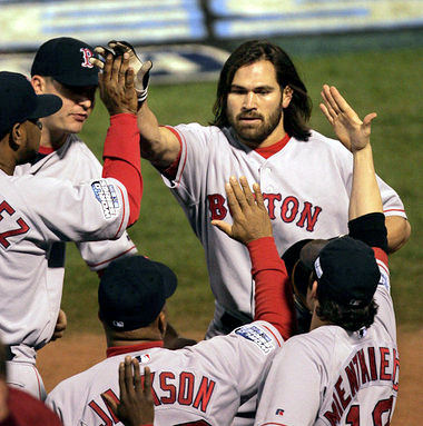 THE "IDIOTS" REVERSE THE CURSE October 20, 2004 ... The 2004 Red Sox won the American League pennant in the heart of the Evil Empire. The Red Sox embarrassed and eliminated the Yankees at their house, 10-3, in the seventh and deciding game of their American League Championship Series. On the very soil where the Sox were so cruelly foiled in this same game one year ago, the Sox completed the greatest postseason comeback in baseball history. No major league team had ever recovered from a 3-0 series deficit. The Sox won the much-hyped finale on the strength of two homers (including a grand slam) by Johnny Damon and a stunning six innings of one-hit pitching from Derek Lowe, who lost his job in the Sox' starting rotation before the start of the playoffs. Pedro Martinez came on for a curious (two-run) relief stint in the seventh, followed by Mike Timlin and Alan Embree. Embree retired Ruben Sierra on a grounder to second for the final out at 12:01 this morning. Sox players and officials celebrated on the Yankee Stadium infield and the area in front of the third base dugout a half-hour after the final out. Thousands of Boston fans gathered behind the dugout and players tossed equipment and sprayed champagne into the stands, while the throng chanted, "Let's Go, Red Sox!"