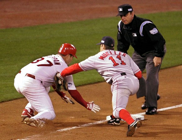 Suppan's gaffe, destined to go into Series lore alongside Fred "Bonehead" Merkle neglecting to touch second base in the 1908 World Series, changed Game 3 in every way. Martinez, who had won only one of his previous seven starts, appeared to be struggling when the key play changed everything in the third. With Boston leading, 1-0, Suppan led off the inning with a nifty bunt single down the third base line. Edgar Renteria followed with a booming double to right. At this point, the Cardinals had runners on second and third with no outs, and four of the best hitters in baseball coming to the plate. Moreover, they'd already put five runners on the basepaths in two-plus innings. It looked as though they had Martinez on the ropes. Red Sox manager Terry Francona conceded the run and had his infield playing back. When Larry Walker, the next batter, rapped a hard grounder to Mark Bellhorn, the second baseman didn't even look toward home. He fired to first, assuming Suppan would score. Suppan did not score. He went halfway down the line, then stopped. By the time he got back to the base, third baseman Bill Mueller was holding the baseball. Martinez struggled to hold it in the bottom of the first. But just when it seemed as if the Cardinals might counter, Ramirez came up big in the field. He caught a fly by Jim Edmonds at medium depth in left field and, with Walker breaking from third, fired a one-hop strike to Varitek in plenty of time to nail Walker.