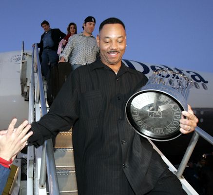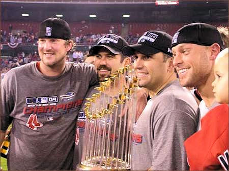 THE "IDIOTS" REVERSE THE CURSE October 28, 2004 ... Everybody hates the dreaded center seat on an airplane. But not if that seat contains the 30-pound, world championship trophy. Pedro Martinez didn't let the ultimate prize of his 13-year career out of his sight during the two hour charter flight from St. Louis to Boston in which most of his teammates and their families napped. Champagne for the most part remained corked. The Red Sox' victory ride was low key. The flight departed at 3:22 a.m. On the long, deserted walk, an airport worker asked David Ortiz for an autograph. Red Sox charters, operated by Delta, are different than flying commercial. The cabin door is not locked. Nobody tells you to turn off electrical devices. The captain has Sox autographs all over his uniform. In midflight, after a bit of turbulence, the master of wind current - knuckleballer Tim Wakefield- comes strolling out of the cockpit with a smile. The first announcement on board comes not from a flight attendant but from pitcher Curt Schilling. The now legendary righthander thanks the 50 players, coaches, and front-office people for their support, and asks management for 50 Harley-Davidsons for spring training. His teammates applaud. Later Schilling, who limped slightly, said he was glad the Series ended in four straight games. Red Sox executive vice president Dr. Charles Steinberg is getting ready for tomorrow's parade. Johnny Damon will be appearing on the "Late Show with David Letterman" Monday, and Jay Leno has booked Damon for next week as well, and now wants the whole team to appear with the bearded wonder. Steinberg is also huddling with Lucchino for a tour that would take the trophy all across Red Sox Nation, including Sox bars in Santa Monica, Calif., and a visit to the Dominican Republic.