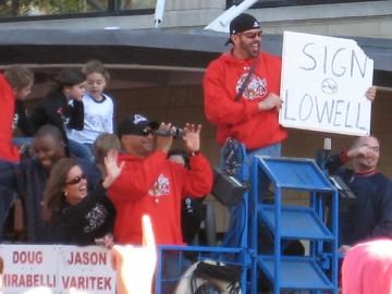 Varitek weighed in on the issue by waving a "Re-sign Lowell" sign from the duck