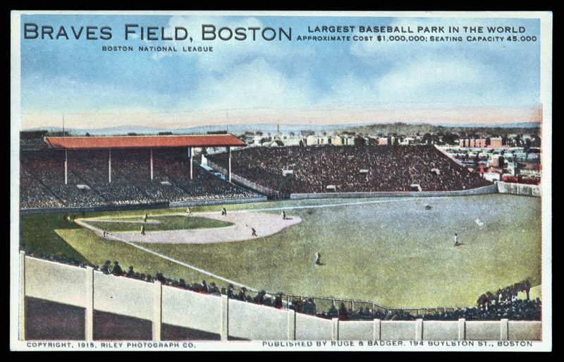 In midseason the Braves picked up veteran Fred Snodgrass, who had been released by the Giants, but he batted only .215 In one game, a single, that he hit, kept the Braves from being victims of a no-hitter pitched by Fred Toney of the Cincinnati Reds. There was a lot of talk of another miracle, when on July 15th the Braves were in last place. They climbed steadily until they were in second place on September 24th, but was as close as they would come to the Phillies. Grover Cleveland Alexander was winning 31 games and losing only 10. He hurled his fourth no-hit game of the season against the Braves on September 29th, clinching the pennant for Philadelphia. Losing the pennant was a bitter pill for the Braves, especially Evers and Stallings. Evers drew a five day suspension for badgering umpires in the final month. Stallings slid up and down the bench yelling at his players. The major event 1915 was the opening of Braves Field. Gaffney had been looking for a site for a new ballpark ever since buying the Braves in 1912. He found what he wanted in the old Allston Golf Club on Commonwealth Avenue. It was a pretty location, with the Charles River meandering lazily in the background between grassy banks and locomotives belching smoke and cinders in the Boston and Albany Railroad Yards in the foreground. The park was built for $600,000, on a lot that measured 850' x 675', containing 593,718 sq ft of land. It was big enough so Gaffney would build, what he thought was the perfect ballpark. He wanted the playing field to be so large that would be possible to hit a home run inside the field in any direction. The Left-field foul line originally measured 402 feet, the right-field line 402 feet, and it was 550 feet to centerfield. Gaffney announced the purchase of the golf course on December 1, 1914 and ground was broken on March 20th. As they had at the end of the 1914 season, the Braves continued to play their home games at Fenway Park until they moved to Braves Field on August 18th.