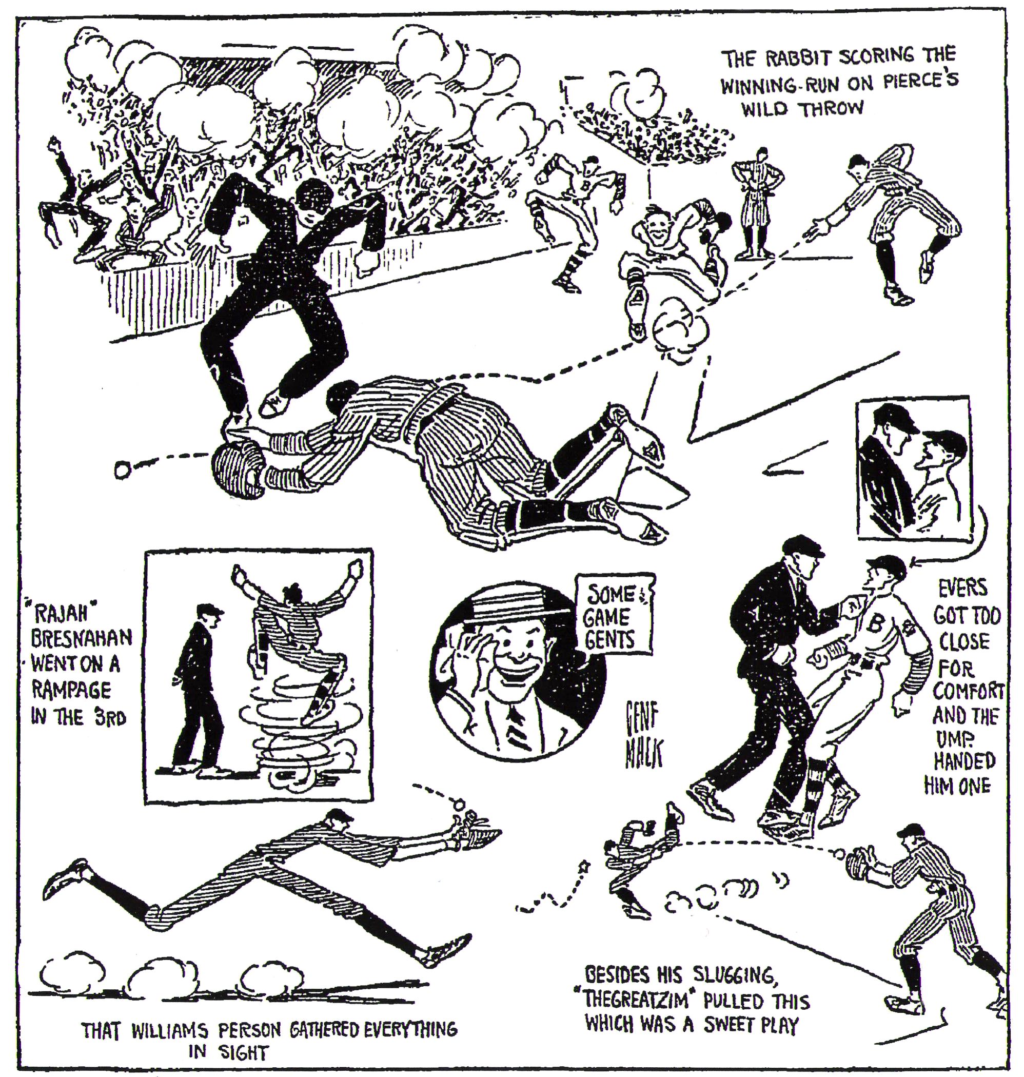 THE 1915 BOSTON BRAVES July 22, 1915 ... There was a great combat at Fenway Park today as the Braves met the Chicago Cubs, but it was not the game. Umpire Ernie Quigley, who on two or three other occasions this season, has been controversial, gave Johnny Evers a vigorous shot, because he claimed the Boston Captain was stomping on his toes. Evers, who was so surprised, retaliated but he did not have much time, as all the players on the Cubs and Braves came out to intervene. Some of them were holding Evers and some of them were holding on to Quigley. Roger Bresnahan grabbed Johnny and shook him vigorously before he began to try and talk some sense into him. A few minutes later Bresnahan looked as if he needed a restraint himself because he hopped up and down for what seemed a full minute to protest a decision by Quigley at the plate, that allowed the Braves runner to score. Other members of the Cubs were throwing their mitts on the ground with disgust and then with upraised arms appealed to heaven to have compassion upon the victims of the umpires poor judgment. That storm subsided, but later it broke again. Heinie Zimmerman became annoyed over decision by umpire Bob Emslie, who was working on the bases. Zimmerman took exception to a ruling and gave him a piece of his mind with some colorful language, that cost him to be told to leave. He thought of a few more things to say on his way to the showers and then disappeared into the dugout. Incidentally there was a baseball game and there was plenty of action in that too, as the play was brilliant, good, bad and indifferent. All around, it was an entertaining day. The Evers-Quigley match took place in the third inning, but before that, batters on both teams were claiming that Quigley was making bad calls. With Chicago in the lead by a score of 3 to 0, Evers came to bat in the third inning. Quigley called two strikes on him and Evers protested each of them. He finally drew a base on balls but complained that he should have gotten on earlier. He made some remarks quickly as he started toward first and the umpire fired back. Evers then turned around to the plate and was indicating on the ground a spot in which the ball passed. In doing this he picked up some dirt and allowed to sift through his fingers and the wind carried it to a Quigley. Quigley then threw Evers out of the game. Now the two men began to approach each other, finally getting as close as they could. Suddenly Quigley made a left short jab which landed just above Evers chest near his right shoulder. Evers appeared thunderstruck, and by the time he realized what happened, the mediators prevented any possibility of the men doing battle. Evers had some further remarks to Quigley and then made it to the bench. As to the game itself, Dick Rudolph started for the Braves and was hit hard. He was taken out after the third inning. Wilbur Good, the first batter to face him, singled and went to second on a sacrifice. He scored on a single by Zimmerman to left. Then in the third inning, Bob Fisher led off with a double and after Frank Schulte popped out to Evers, he scored on a triple by Zimmerman. Zim later scored on Art Phelan's double to left, giving the Cubs a 3 to 0 advantage. Pat Ragan pitched good from that point on until he was replaced by a pinch-hitter in the eighth. Tom Hughes pitched the ninth without a hitch. Down 3 to 0, the Braves had an uphill fight when they started their half of the third. Joe Shannon, pinch-hit for Rudolph and singled over first. He was followed by Herbie Moran who singled to center. After the Evers-Quigley dust up, Ed Fitzpatrick was put in to run for Evers and with the bases full, Dick Egan lofted a fly ball to right-field bringing Shannon came home after the catch with the first Braves run. In the fourth inning the Braves got another run when Red Smith led off with a screaming triple to right-center and scored on Hank Gowdy's single, making it 3 to 2. The Braves tied the score in the fifth inning on a single by Egan and a double by Sherry Magee, bringing the crowd to a frenzy. The crowd went wild when the Braves put over the go-ahead run in the eighth-inning. After Smith sent a liner to deep left field, Maranville singled. Gowdy hit a slow roller down to Zimmerman at second, who got the ball and looked at Maranville who stopped dead in his tracks and refused to be tagged. When Zimmerman realized this, he made a jab at the Rabbit, who sidestepped him and went into second base. Zim then quickly threw the ball the first but it was too late to get Gowdy. Zim claimed that Maranville and run outside the baseline to avoid being tagged and argued so long about the decision, that he was thrown out of the game. Bert Whaling came in to bat for Ragan and before he could do anything, Maranville and Gowdy pulled off a double steal. Now with runners on second and third, the big blow up came. Whaling hit a sharp grounder back to the pitcher George Pierce, who made a great stop and he had the Rabbit trapped between third and home. Maranville dodged and weaved, and made it back to third, where Gowdy had already arrived. Pierce apparently did not know which of the runners to tag and before he made up his mind, Gowdy took off back toward second base. Pierce started to throw, and as he did, much to the surprise of everyone, Maranville took off for home. Pierce then stopped and turned to throw home and the fans gasped, as it was obvious that Maranville would be thrown out. But Pierce's throw went wild and the Rabbit scampered over with the winning run. It was a great game to watch and exciting at every turn. After the game both Quigley and Evers both said they regretted the incident. |