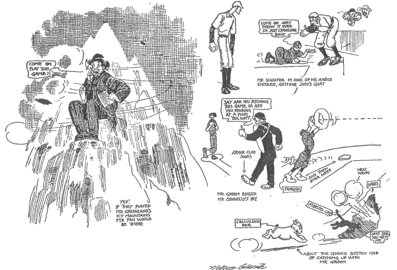 FENWAY'S FIRST TEAM April 23, 1912 ... The Washington Nationals made their first appearance at Fenway Park to a small selection of Boston fans, who weathered the gale that came ripping out of the northwest, to root for the Speed Boys. The Red Sox however, were far from their best, even with a strong team in the field and the Kansas Cyclone, Joe Wood, on the rubber. They were in trouble in the third inning when Washington scored three runs which was enough to win the game. The final score was 6 to 2 and the Nats were banging Wood's fast ones in a savage manner. Both pitchers were rather wild, keeping their catchers very busy behind the plate. Washington starter Bob Groom managed to pull out of trouble but Joe Wood failed to get his man under similar circumstances. The field was slowing the players must have been chilled to the bone, which would account for many of the misplays. In fact it was like a bleak cold day in November and the weather could of been blamed for most of the miscues. The difference in the game was the hustle that they Washington team showed, as compared to the Red Sox, and with Groom pitching well, the Nats looked like winners after the third inning. The Red Sox had two great chances to get back into the running. Once with the bases full in the fourth, Wood struck out, and again in the sixth, when with men on second and third, with Wood at the plate, he sent a weak pop-up to Bill Cunningham, while Harry Hooper followed with a strikeout. Jake Stahl and Larry Gardner had a chance to tie up the game in the seventh, when with Speaker on second, Stahl struck out as did Gardner. The Red Sox scored the first run of the game in the second inning. Duffy Lewis opened with a single and went to second on a sacrifice. Then, with two down, he scored on a wild pitch just before Wood struck out. Then in the third inning, Heinie Wagner threw low to first, allowing John Henry to reach. Wood passed Danny Moeller and Kid Foster dropped a single into right, and made it to second base as Tris Speaker juggled the ball. Henry scored the tying run on the play, before Germany Schaefer knocked one into left field to score two more runs. Down 3 to 2 in the sixth inning, Gardner reached first on Ray Morgan's low throw. Lewis popped out to second and Wagner singled, sending Gardner the third. The fans at this point got excited and thought the Speed Boys were coming on fast. Les Nunamaker singled to score Gardner, but then Wood fanned and Hooper struck out. Washington went down in order in the seventh and then came the eighth with some more fireworks. John Flynn lined one over Speaker's head for a double. Stahl came in quick to get a bunt from Billy Cunningham but then was slow in getting his throw over to Wood who was covering, allowing Cunningham to reach and Flynn to get to third. Morgan singled to score Flynn and Speaker fumbled the ball, so Cunningham made it to third and Morgan down to second. They both scored on a single by Groom, making the score 6 to 2. In the bottom of the eighth, Duffy Lewis was passed, but was caught napping at first and the rest was easy for Washington in winning the game. |