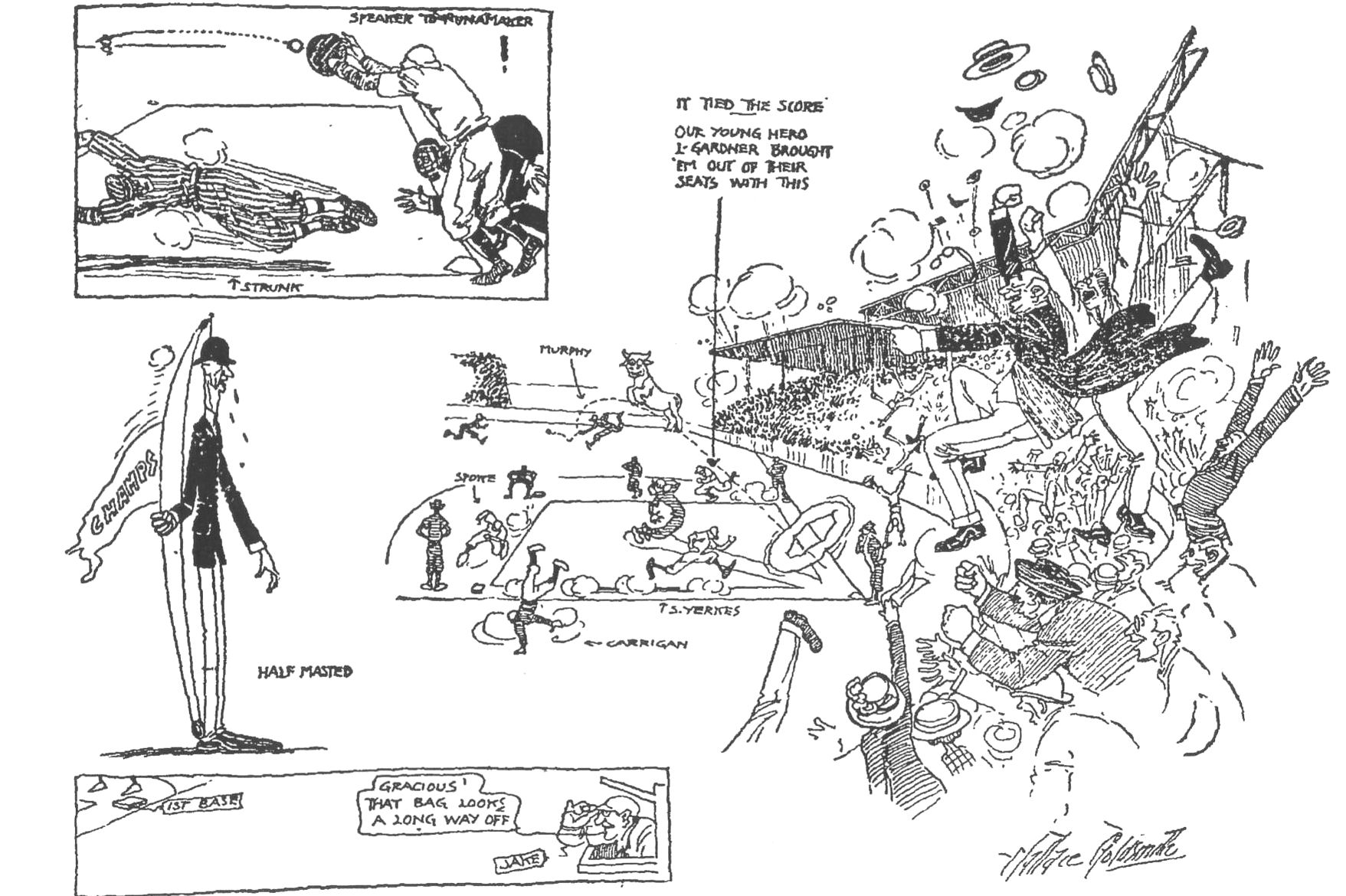 FENWAY'S FIRST TEAM April 27, 1912 ... The champion, Philadelphia Athletics got a good lead in today’s game, but their inability to hit Sox ace, Joe Wood developed, and when the Sox got Boardwalk Brown’s measure and began hammering him, they lost their heads. The game at Fenway Park was another one of those sensational ballgames where one team gets off to a commanding lead, and the other team comes tearing back at breakneck speed to cross the finish line a winner. The Athletics scored first in the second inning. After Frank Baker grounded out, Danny Murphy singled as did Stuffy McInnis. Murphy moved over to third on the base hit and scored on Jack Barry's out at first. Ira Thomas singled home McInnis and the Athletics were up 2 to 0. They increased their lead in the fourth inning as Baker opened up with a single and stole second. He then tried to steal third and scored when catcher Les Nunamaker threw the ball into left-field. McInnis doubled and Barry singled to score McInnis with the fourth run. The Sox came back with a run in their half of the fourth as Steve Yerkes singled and pitcher Boardwalk Brown threw wild to first, trying to keep him close. Yerkes tried to go all the way around to third, but was thrown out. Then Tris Speaker singled and stole second, going to third when Thomas threw wild to second. He scored on a base hit by Hugh Bradley to make it 4 to 1. In the fifth inning Brown drew a pass but was forced out by Strunk. Rube Oldring hit one by Yerkes that sent Strunk to third. On the next pitch Eddie Collins singled to score Strunk with the fifth Philly. After five innings, the Red Sox were down 5 to 1 and the big crowd sat back to just see how bad the beating was going to be. Brown was pitching a good game for the A's, while Joe Wood was proving easy pickings for the visitors. But Wood bore down in the sixth inning and struck out two men and got the third man out on a pop fly and no Athletic player was allowed to reach base after that inning. However with the way Brown was pitching, it did not look good for the home team. Then in the sixth inning, things began to happen. Harry Hooper singled and Speaker doubled. Hugh Bradley came up and smashed the ball to left for two bases, scoring two runs. The Athletics were now only two runs to the good. Then came the eighth-inning. Yerkes was passed and Speaker singled. There was a delay while the visitors talked it over, as Bradley was coming up, and it was feared that he would hit the ball hard somewhere. Bradley fooled them however, and laid down a clever bunt, moving the runners over. That put it up to Larry Gardner, who smashed the first pitch he saw, for three bases and the Speed Boys had tied it up. Duffy Lewis was very eager at the plate and sent the first ball to right-field for a double, scoring Gardner with, what would be, the winning run. The crowd went into a frenzy and Wood pitched a perfect ninth-inning sending everyone home with a satisfactory come from behind victory. There were several sensational plays. Rube Oldring took a low liner from Wood on the dead run, and picked it off just above the ground. Jack Barry made a sensational running catch of a Texas Leaguer in short right field, and Danny Murphy made a clever running catch in the eighth inning, when the Red Sox were tearing it up and got to second for a doubleplay. Tris Speaker made a great throw to the plate after taking a fly ball to double up Amos Strunk. Then he closed the game with a sensational play taking the ball at full reach after a long run and getting cheered by the fans. Threatening skies up until noon and cloudy weather all day kept many away, especially the out-of-town people, and yet there was still a fine crowd when the game started. |