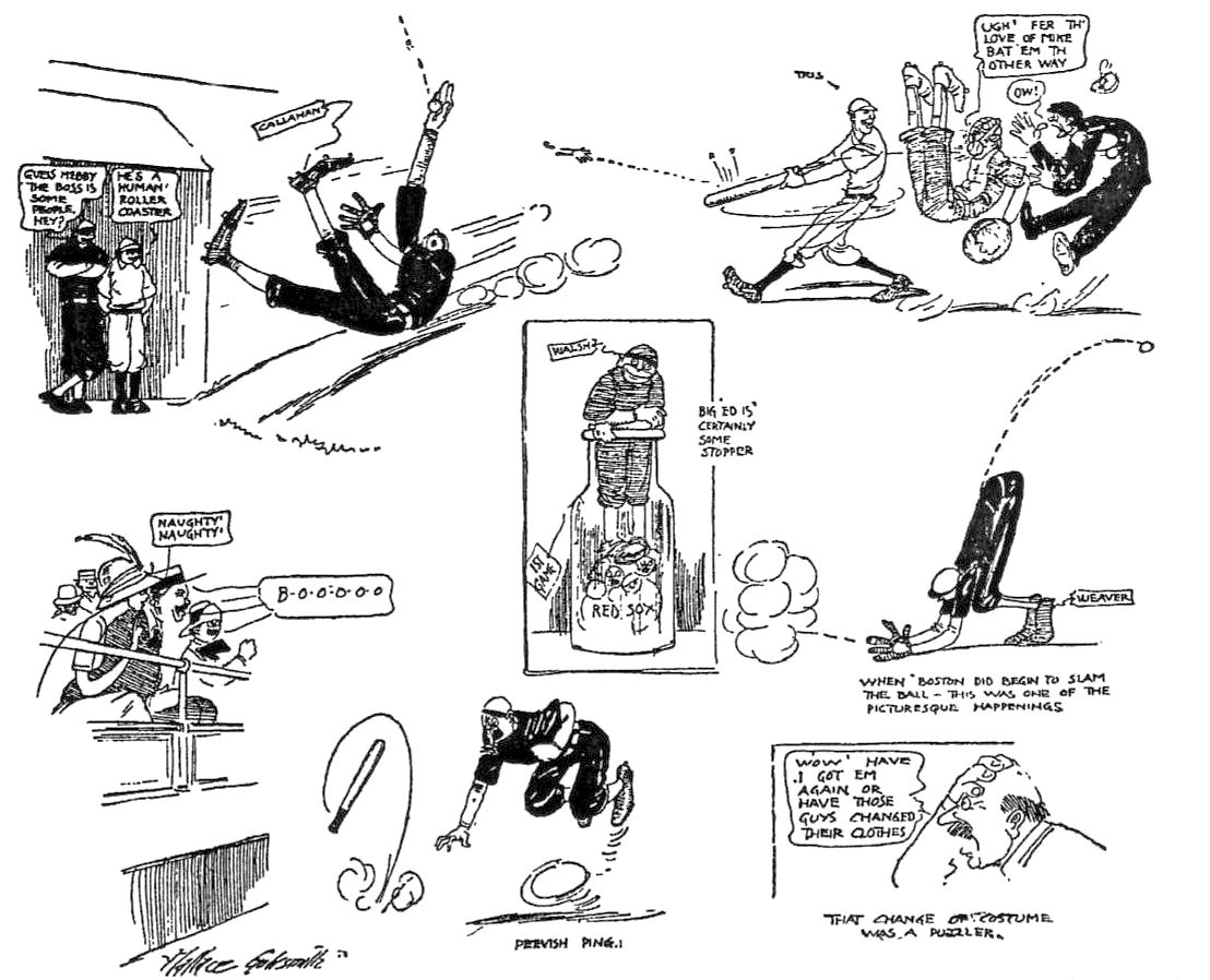 FENWAY'S FIRST TEAM July 17, 1912 ... Jimmy Callahan and the Chicago White Sox game to Fenway Park today for a couple of rounds with the Speed Boys in front of 21,000 enthusiastic fans. The fans were well-paid for coming, as they saw two great games, with the White Sox taking the first game by a score of 1 to 0m Buck O'Brien matched against Ed Walsh, and the second game going to the Red Sox, 7 to 3 with Joe Wood beating Rube Peters. Ed Walsh pitched an extremely good game, holding the Red Sox to just two singles made by Duffy Lewis and Larry Gardner, and he seemed to pitch better and grow stronger as the game progressed. However it must be said that Buck O'Brien also pitched a superb game that went down to the last inning with two down, before Buck Weaver came up with the winning run. Eddie Collins reached first in the ninth when Larry Gardner failed to come up with his fast ground ball. Ping Bodie sacrificed him to second and Jack Fournier sent up a weak pop-up to third that Gardner gathered in. Weaver came to the plate and hit one to the fence in left-center field, good for three bases and scoring Collins with the only run of the game. The game was well earned by the visitors who put up a significantly good fielding game, especially Weaver at short and Morrie Rath at second. The fans had little chance to root for the Red Sox in the first game and the visitors looked very pleased when the last Boston man went out. The White Sox retired to their dressing room and changed their faded gray uniforms for a set of dark blue ones and came out and went after the second game. They scored in the very first inning on singles by Rath and one by Harry Lord, that sent Rath the third. Larry Gardner fumbled Eddie Collins' grounder and that allowed Rath to score the first run in the second game. The home team went along for three innings with only singles by Speaker and Hooper but both men were thrown out. Speaker was nailed at the plate by Lord, who fumbled a grounder from Lewis and then chased the ball past the pitcher's mound and nailed Tris at the plate on a close call. The Red Sox got busy in the fourth inning and scored two runs. Steve Yerkes hit the ball to left-field fence for two bases and Speaker singled, with the ball hitting the base at second. Speaker then stole second and Lewis was thrown out by Rath, who took the ball far behind second base, allowing Yerkes to score on the play. The infield closed in but Gardner hit the ball through them to score Speaker with the second run. He was then caught napping at first, thereby throwing a run away, as Jake Stahl knocked one out for two bases to follow. The Red Sox scored one in the fifth on a single by Hick Cady and a double by Joe Wood, with the ball being thrown by the catcher, allowing Cady to score. The White Sox came back with two in the sixth on bungles by the Red Sox. Callahan led off with a single and then stole second. Harry Lord struck out, but the ball hit the ground and broke away from Cady, who with plenty of time to get his man at first, but threw it to third too late, and both men were safe. Ping Bodie came up and hit a ground ball out to Larry Gardner, who found out he was too late to get Callahan at the plate, and then threw the ball past Jake Stahl at first, allowing both the runners to get the second and third. Buck Weaver hit a ground ball to Heinie Wagner that he tried to throw before he actually caught it and the runners scored to tie up the game at 3 to 3. Steve Yerkes in the sixth inning and Jake Stahl in the seventh inning led off with singles but never reach second base. However the Red Sox put the game on ice in the eighth-inning. It was opened with a single to center by Harry Hooper, then Yerkes smashed one through short that allowed Hooper to slip over the third-base. Speaker hit one to Harry Lord who got the ball behind third, but the throw was late at first and Hooper scored the first run of the inning. Duffy Lewis sacrificed Speaker over but was safe as the ball was thrown wide of first. With the bases now full, Larry Gardner stroked one to centerfield that scored one run, and Speaker practically stole home, as the ball was held in the infield. Stahl then struck out and Lewis tried to steal third but was thrown out by three yards. Heinie Wagner finally singled to score Gardner with the fourth run of the inning, giving the Red Sox the ultimate win by a score of 7 to 3. |