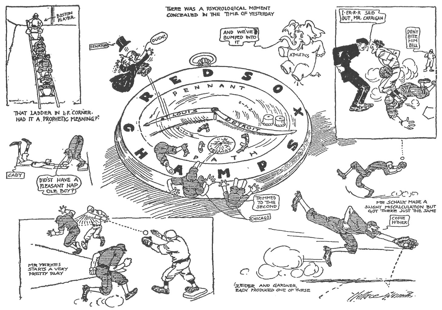 FENWAY'S FIRST TEAM August 28, 1912 ... A crowd of 20,000 fans gathered at Fenway Park to see the Speed Boys sweep a doubleheader from the Chicago White Sox. The first game was a thriller, with the Red Sox completing a doubleplay in the ninth-inning, with men on first and third and only one out to maintain a 5 to 3 score. In the second game Joe Wood shut out Chicago to the tune of 3 to 0. He was only in the hole once, in the eighth-inning, when he was touched up for three singles with one out, filling the bases. But then Wood got the batter to hit into a valuable doubleplay. In the first game it was Buck O'Brien who started out strong. Not a hit was made off him until two were out in the fifth inning. In the sixth, with two gone, Chicago smashed out three drives that included a double that scored two runs. Boston was then leading 5 to 3 and Hugh Bedient began to warm up. O'Brien got away in the next inning, but the visitors came back again in the eighth, once more turning in three hits including a double. Thanks to some superb fielding however, no one runs were able to score. Shano Collins burned one over Tris Speaker's head to the centerfield bleachers in that inning. Speaker hustled after the ball and made a perfect throw to Steve Yerkes in short center field. He threw it over to Larry Gardner, who got Collins as he slid over the base. Ping Bodie and Rollie Zieder singled, but Buck Weaver struck out to end the threat. There was more trouble for the Red Sox in the ninth when O'Brien hit Ray Schalk the first player up. The next man grounded out to Larry Gardner but then Morrie Roth singled and Wally Mattick was thrown out by Heinie Wagner. On the play Schalk loafed in from third only to find Bill Carrigan blocking him off at the plate, having gotten the ball from Engle to tag him out. Had he scored, and with Rath at second, it would have been up to Harry Lord to bring home the tying run. In the first inning Gardner saved one run with a marvelous one-handed running stop and got his man at first for the third out, with a White Sox player tearing for home at the time. The White Sox earned two of their three runs and got the other on a fumble by Steve Yerkes and a poor throw to first by O'Brien. The Red Sox runs were kept from scoring in the first four innings. Joe Benz held them to one hit in the last four innings. The first run was made by Hooper in the first inning, who led off with a triple, and scored on Speaker's sacrifice fly. In the third inning after the White Sox and scored a run to tie the game at 1 to 1, O'Brien and Harry Hooper were both walked. Yerkes missed two tries for sacrifice bunt and then hit a ground ball that forced Hooper at second. Speaker came up next and hit one to the bank for two bases, that scored O'Brien. Duffy Lewis hit one to Morrie Rath and Yerkes was thrown out at the plate. But then Larry Gardner doubled to score Speaker and Engle ended the scoring by being thrown out at first. Two more runs were added in the fourth inning on free passes to Heinie Wagner to Carrigan. O'Brien sacrificed them along and Hooper hit one down to Weaver who threw home to Ray Schalk in an attempt to cut off the run. But Schalk muffed the throw and the ball rolled behind him, allowing both Carrigan and Wagner to score. On the play, Hooper tried for third, but Schalk threw him out. With the score 5 to 1 against them in the sixth inning, the White Sox scored two runs with two outs. Ping Bodie singled and Rollie Zieder lined one to centerfield that Speaker fumbled, allowing Bodie to scamper to third. Weaver followed and smashed one off the left-field wall that scored the two runners. In the ninth-inning, O'Brien started by hitting Schalk with a pitch. After pinch-hitter Ted Easterly popped out, Rath singled. Mattick then hit a ground ball down to Wagner who threw to Clyde Engel at first, who in turn threw to Carrigan, as Schalk was making a run for home. However Carrigan was blocking the plate and Schalk was out in a doubleplay that ended the game. In the second game, not a visitor reached second base until the eighth-inning and they had only gotten three singles up until that time off Joe Wood. The Red Sox got all their three runs in the fourth inning when with one out, Speaker worked a pass, Duffy Lewis singled to center and Speaker went to third. Gardner then lashed one out for two bases to score Speaker and sent Lewis to third. Engle came up next and dropped in a Texas leaguer to short right field, to score Lewis and Gardner for the three runs. Hick Cady was the only Red Sox runner to reach first until the seventh inning, and he was thrown out trying to stretch a double into a triple. In the ninth-inning for Chicago, Harry Lord flied out to center and then Wood ended the game by striking out both Shano Collins and Ping Bodie, thereby earning his 28th win of the year with a 3 to 0 shutout. |