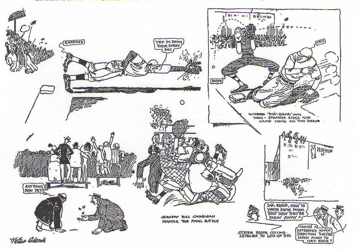 FENWAY'S FIRST TEAM August 31, 1912 ... The largest crowd that ever saw a game at Fenway Park, estimated at 30,000 people, saw one of the classes games played of the season between the Red Sox and the world champion Philadelphia Athletics. To the supreme delight of the rooters from Boston, the Red Sox came home as 2 to 1 winners. The big grandstand was packed to overflowing and the bleachers were so jammed, that 6000 people circled the playing field, where they were held in check by a rope barrier. Women held positions of advantage on stepladders and boxes, as well as from the top of the bank in left field. All hits that went into the crowd were ruled as ground rule doubles and the Red Sox got slightly the worst of it from that enforced condition. The crowd was good-natured and delighted to see the last man go out and Boston declared the winner of the third straight game with the Athletics. The game was played without the least amount of protest, with both teams getting down to business at the start, and playing from start to finish in a smooth fashion. Jack Coombs was Connie Mack's choice to take at least one game from Boston and he pitched a great game. Manager Stahl decided to give Buck O'Brien a chance to get a win and Buck was all good. With two down in the fourth inning and Stahl at third, Buck drove a single to center to send the first run over the plate, and this one run looked large for seven full innings. The Athletics got a man to second with one out in the second inning, only to see Steve Yerkes throw the next two men out at first. When Frank Baker opened the fourth with a double, it looked like trouble. Stuffy McInnis followed with a bunt, but O'Brien played the ball to third for an out and cut off a scoring threat for that inning. The A's got into a fine position with a double steal in the sixth inning, placing men at second and third with one down. It was here that O'Brien came through and struck out McInnis and got the next man to ground out. A single by Jack Lapp and Eddie Murphy's double put men at second and third in the seventh, but then Amos Strunk hit a line drive that was pulled in by Duffy Lewis. Tris Speaker scored, what proved to be the winning run, in the eighth inning. He walked and Lewis sacrificed him to second. Speaker saw an opening and then shot for third and catcher Jack Lapp was hurried when he threw the ball to the base. Baker partially blocked the throw but Speaker was on the move and kept on going, beating the return throw to the plate, to make the score 2 to 0. The Athletics were still in the game in the ninth-inning. Jack Barry led off with a double into the crowd in left-center and Yerkes handled grounders from Lapp and Coombs, which allowed Barry to score and cut the deficit to just one run. Murphy came up and worked a pass and then shot for second but was cut down on a great throw Bill Carrigan. It was now up to Amos Strunk with the tying run at second base. Strunk smashed the ball and it went soaring into the air, working back toward the grandstand. Carrigan took off his mask and went after it, breaking through the crowd and taking the ball a yard from the front of the stands and the game was over. O'Brien's support was nothing short of remarkable. Yerkes turned in seven assists, four of which were on hits well to his left. His work was as clean and smooth as possible, with several place preventing runs. Larry Gardner had only two chances at third and both were from the bat of Jack Barry. The first was a drive well to his left that Larry nipped with his left hand on the dead run and threw Barry out at first. Gardner's second play came when Barry hit a low line drive well to his left, the ball not going more than six inches off the ground. Gardner dove out like a shot and came out of the dirt with the ball clutched in the air. The crowd and players alike yelled their appreciation of the remarkable plays. The play was enough to take a flight out of the Philly team. The Athletics scattered their six hits throughout five innings. Coombs passed only two men and one of those scored, while the five walked by O'Brien gained nothing. The victory gave the Red Sox 13 wins in the 19 games played with Philadelphia. |