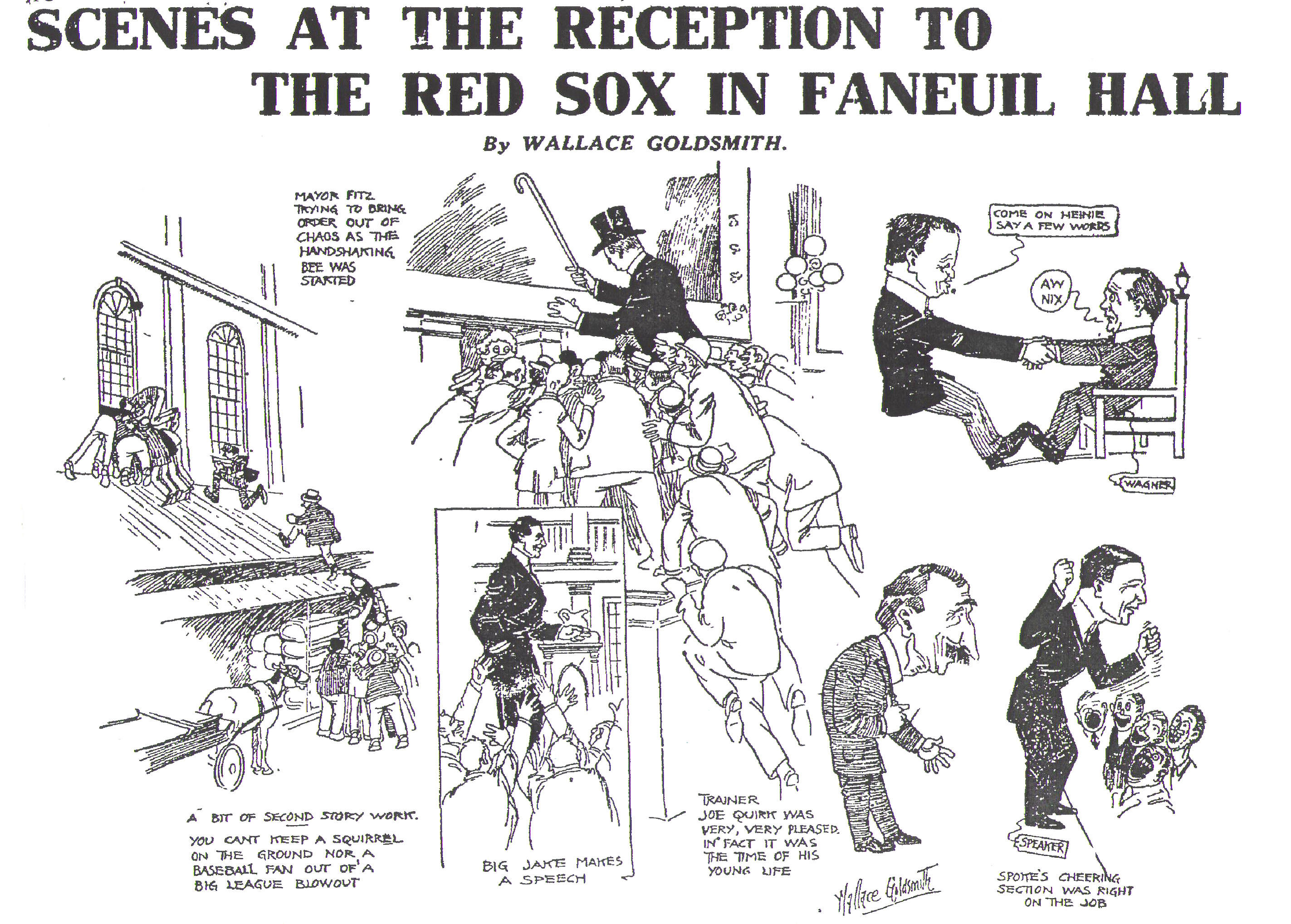 FENWAY'S FIRST TEAM October 17, 1912 ... The Mayor arrived at Fenway Park before noon congratulating each player in the dressing room. Twelve autos were waiting to take them downtown. The Mayor’s car headed the procession and beside him were manager, Jake Stahl, Hugh Bedient, Tris Speaker, Joe Wood and Olaf Henriksen. Headed by the band, they made their way through the streets from Fenway, down Jersey St, to Boylston Street, to Mass Ave, to Columbus Ave to Park Square and finally to Fanueil Hall, to a packed, yelling, singing and cheering crowd. The volume of the cheers inside the hall was terrific, while the size outside was a seething whirlpool of humanity. Every seat in the hall was taken and the aisles jammed. The place was full before the team arrived at 1PM. Inside the hall, the Royal Rooters were wildly enthusiastic and allowed the speakers to speak. The Mayor was the biggest fan. He introduced each player by acknowledging what they had done in the World Series, therefore allowing the crowd to know who was about to be saluted. The players, all seated on the stage looked like they would rather face Christy Mathewson again, than speak to this crowd. When the captain, Heinie Wagner was called on and appeared reluctant to talk, someone shouted out “Don’t strike out!!!” |