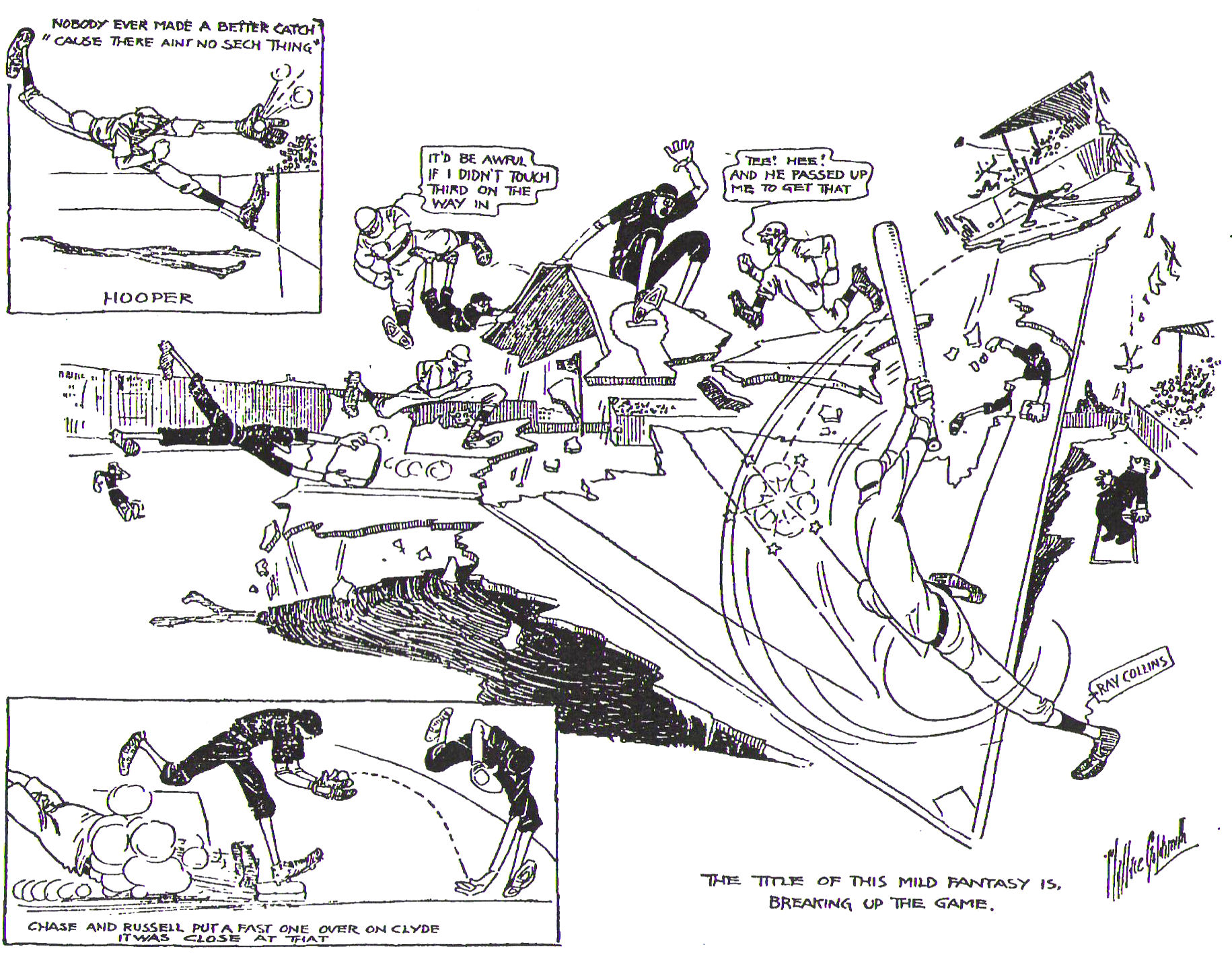 It was a winning hit, for the home team was unable to score after that and Collins returned to the box and worked as hard as he ever had to win the game. Harry Hooper helped him with a remarkable catching the second inning. Jack Fournier hit one well inside the right-field line heading for