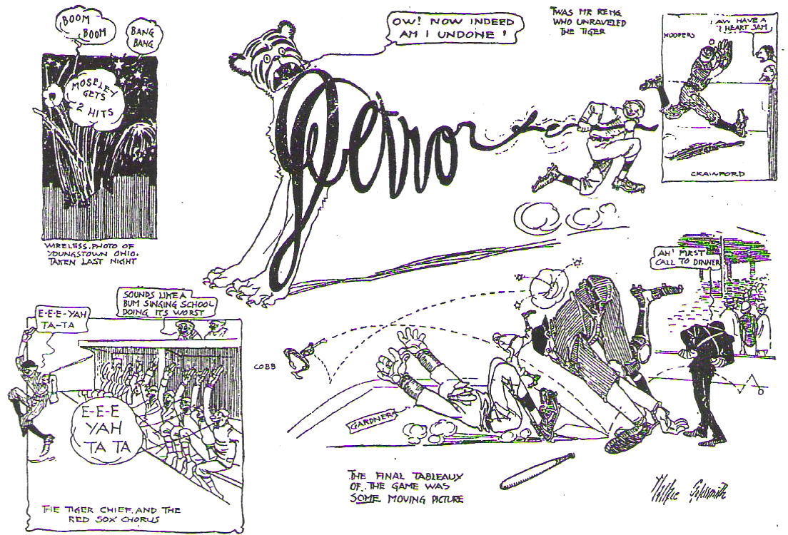Hughie Jenning's Detroit Tigers were properly caged by a score of 3 to 2. Throughout the game there were many brilliant plays, but the contest seem to lack life. Jennings was out on the coaching lines trying to get his Tigers in a hustling mood, while the Boston players seem to get a good deal of fun out of the game from the