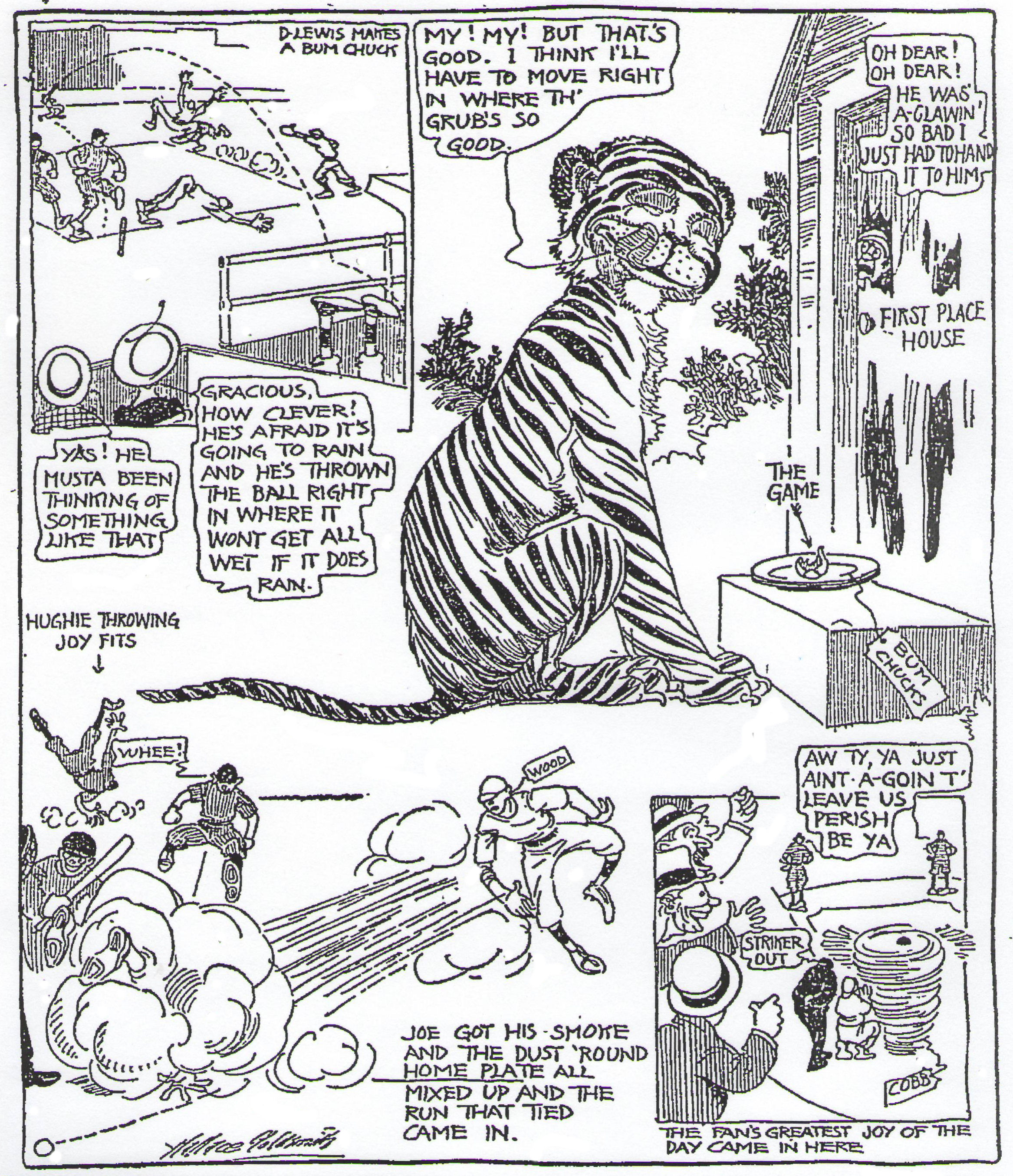Joe Wood was now on the mound and had no command. He walked Ossie Vitt with one out. Donie Bush laid down a beautiful sacrifice bunt, which Joe hurried to get and threw off-balance into right field, allowing Bush to go to second and Vitt to third. With Ty Cobb up, Joe