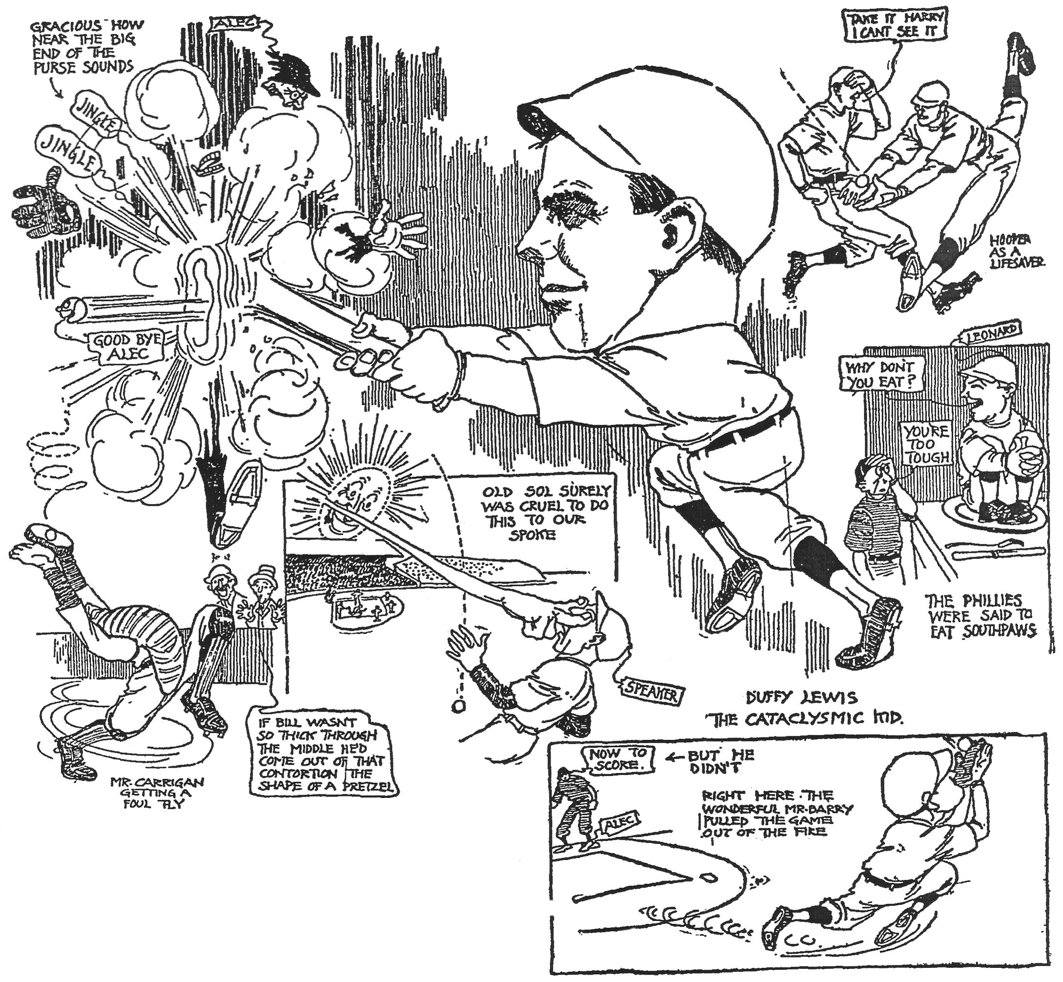 this inning Leonard tightened his game and never even issued a simple pass, thus turning in the greatest game of his professional career. Starting with the last out of the third inning, he retired 20 Philly batters in order with four strikeouts.