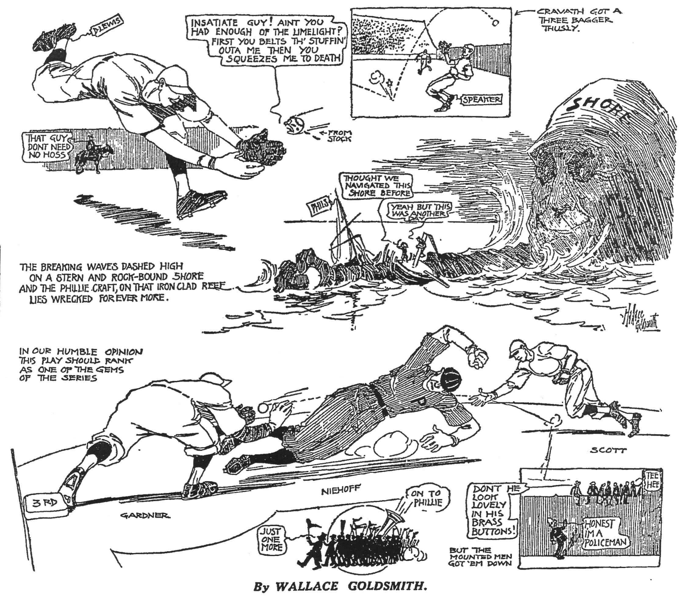 times at bat. And yet, if not for Tris Speaker failing to stop a ball in center field, Philadelphia would not have scored a run. The Phils came within a base hit of tying the score in the eighth inning. With two down, Cravath smashed a liner to center. Speaker,