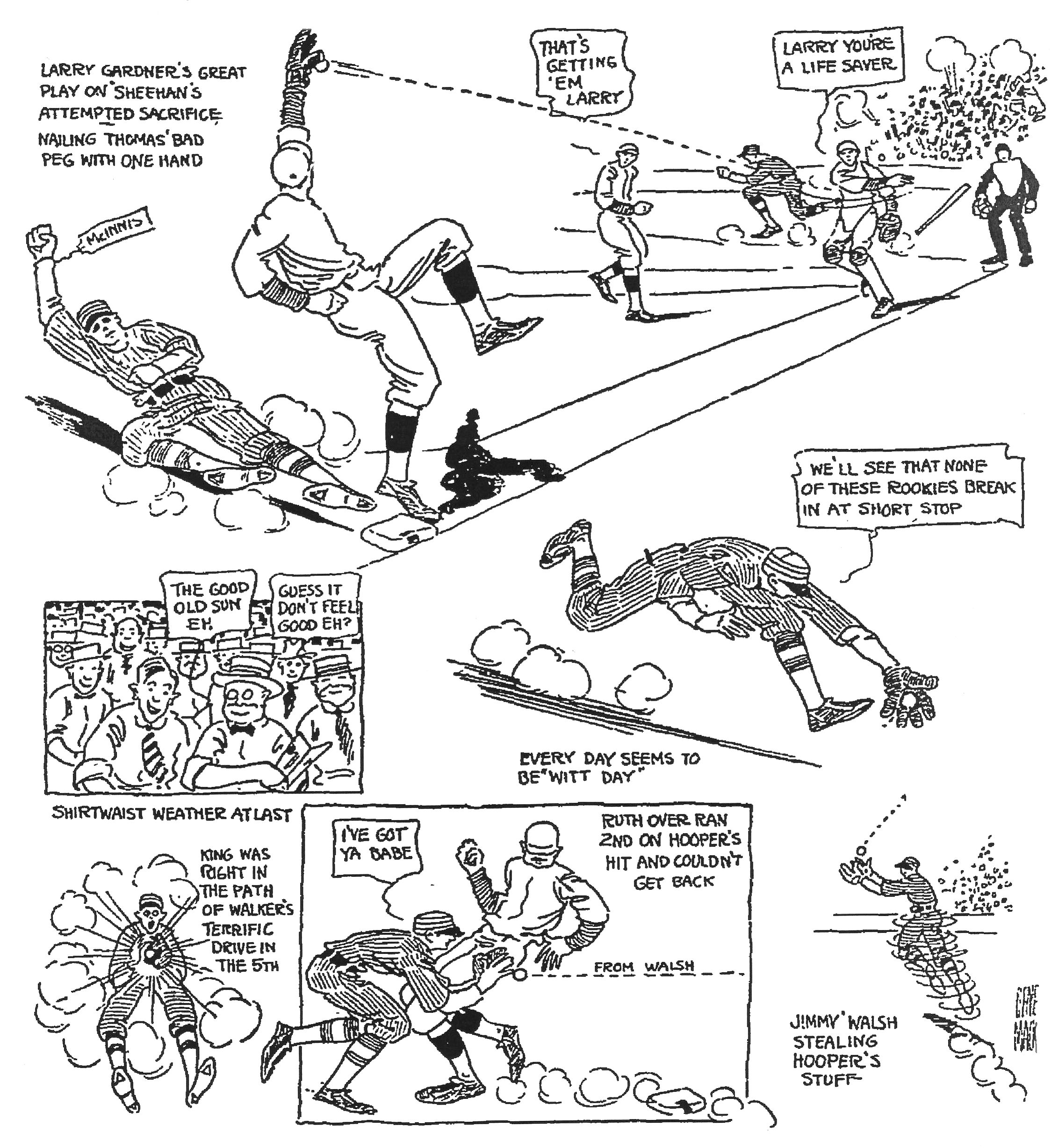 The Athletics came back with their first win at Fenway Park of the year by a score of 8 to 5. Manager Bill Carrigan used 20 of his players to try and keep the winning streak intact, but the A's were on their toes, banging out 14 hits