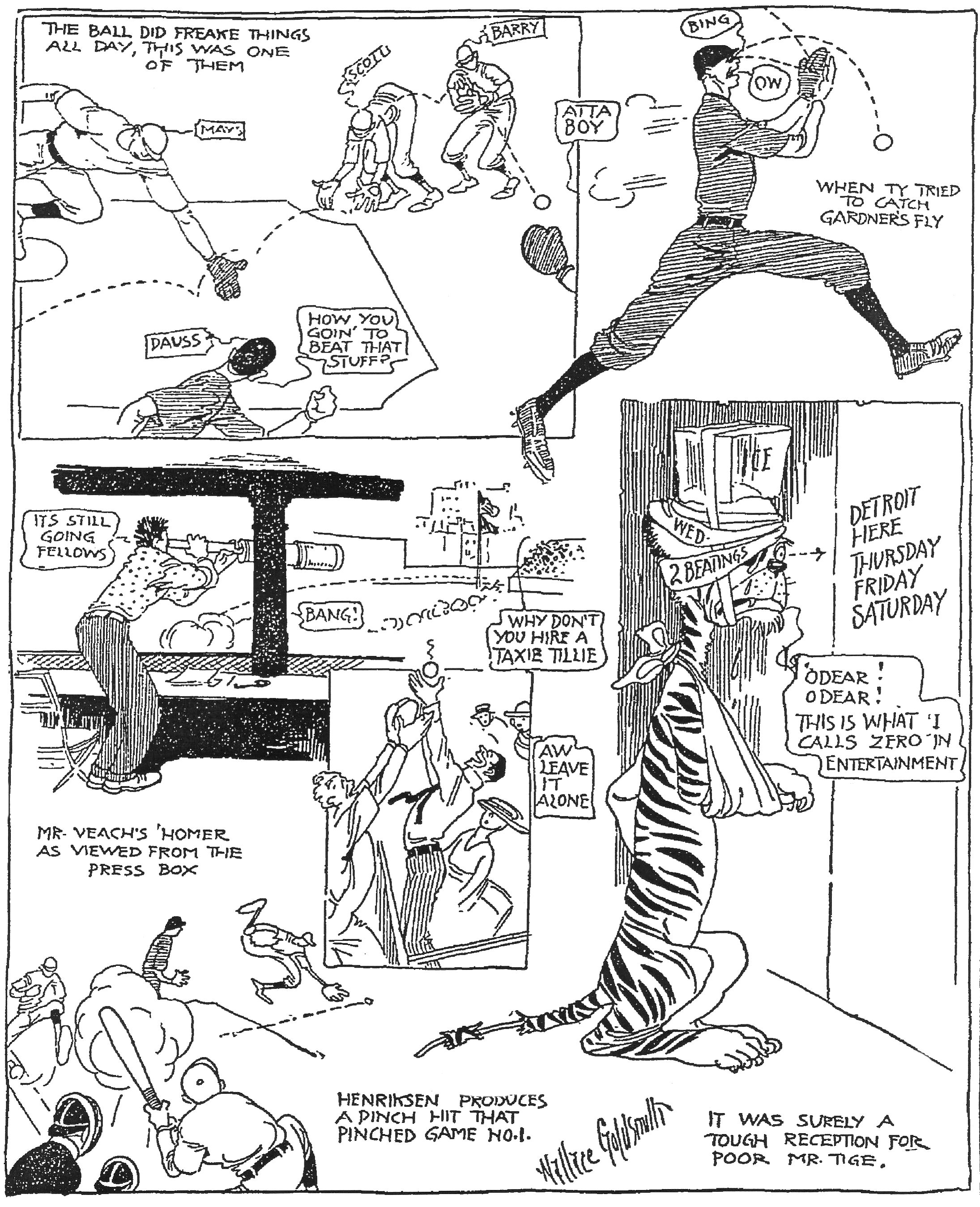 After a brief rest, the two teams went at it again with Ernie Shore matched against George Cunningham. The Tiger hitters found Shore easy and forced him out of the game with one out and the bases full in the fourth inning and the Sox leading 6 to 3.