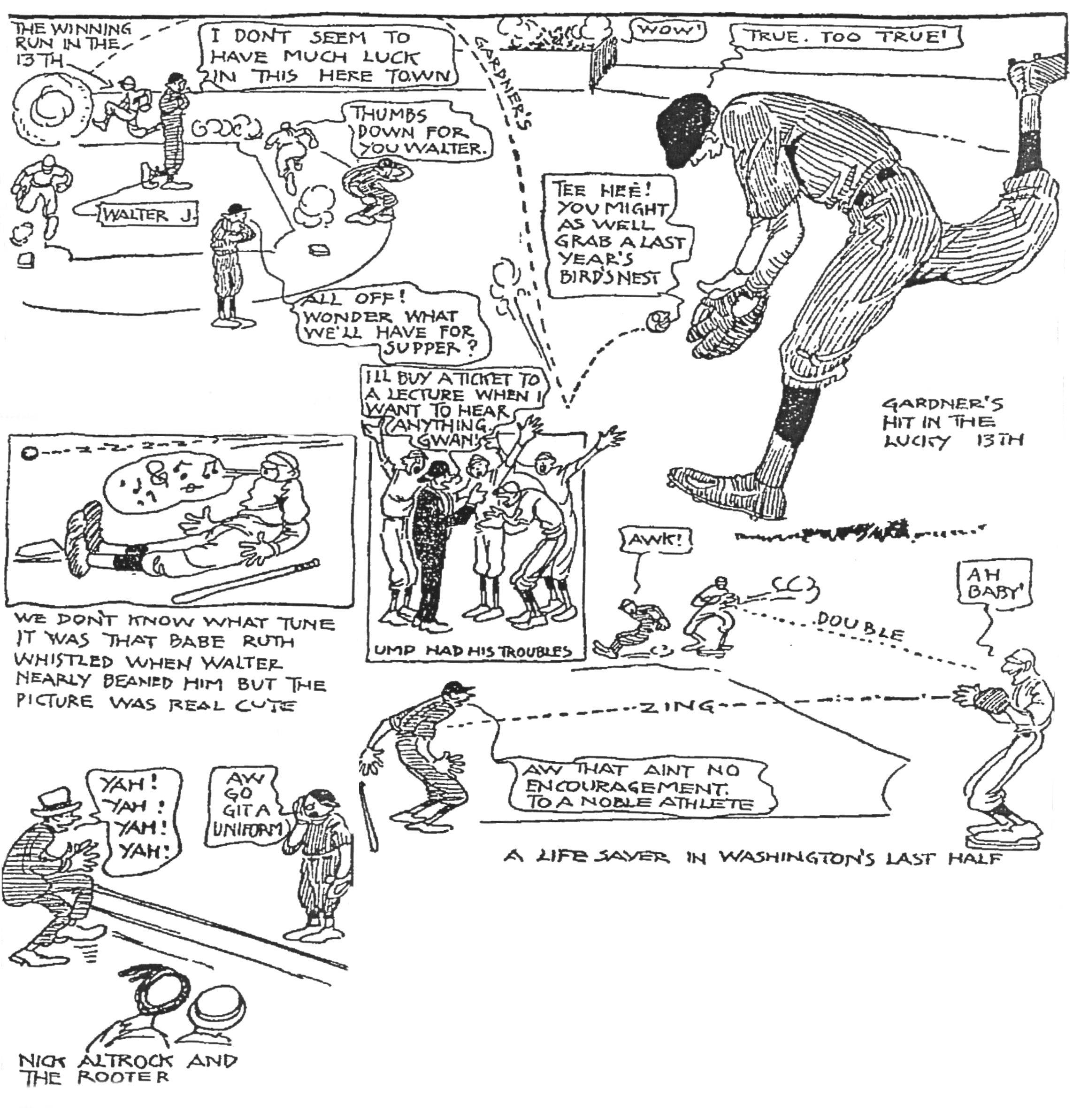 Walter Johnson was on the mound for the visitors and was never in better form or showed more stuff. He was frequently cheered by the crowd, who figured that he was showing invincible form and, seemingly, overlooked the fact that “Babe” Ruth was