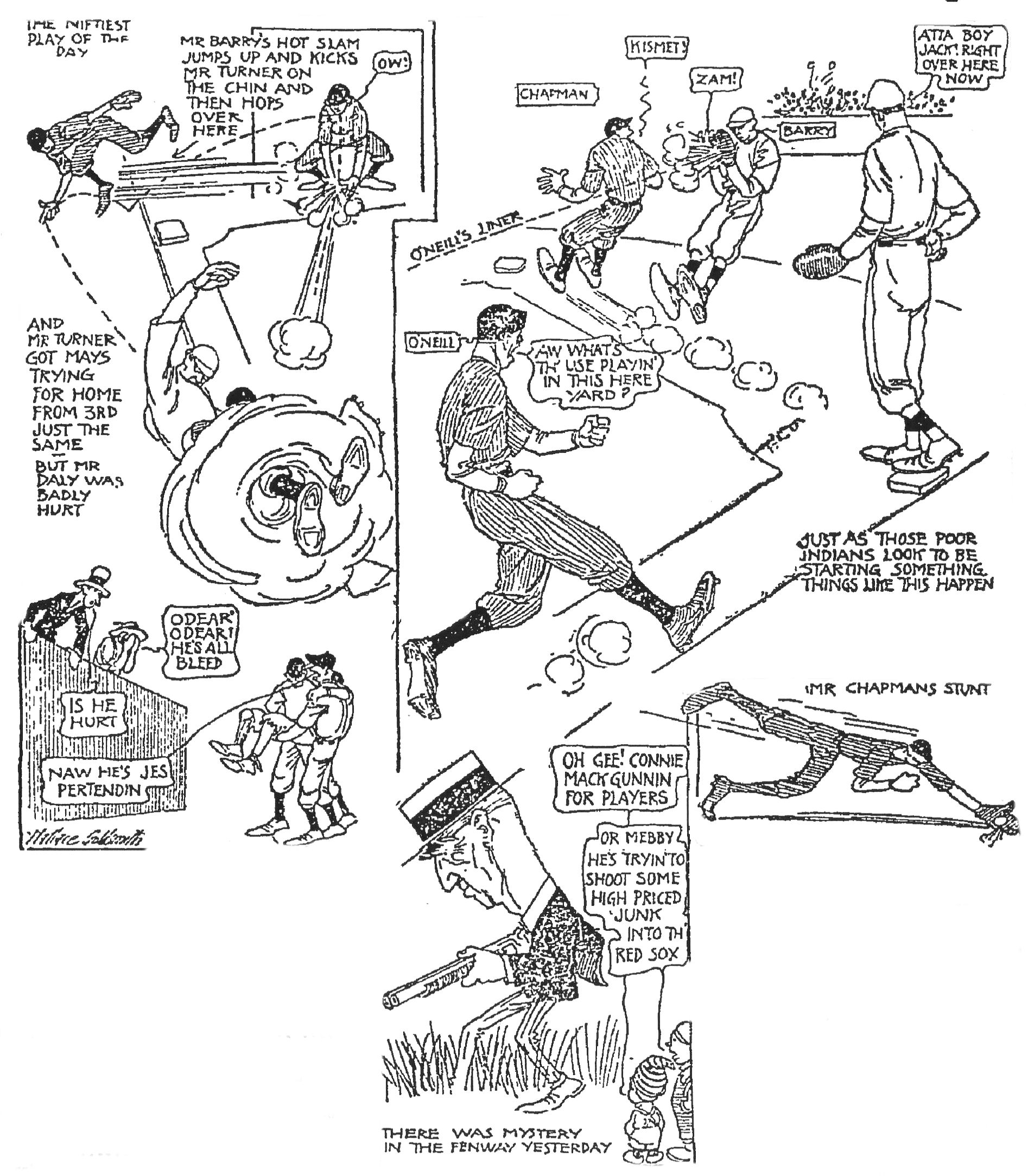 who threw out Hooper at home. Dick Hoblitzell grounded to Chapman, but his throw home was late and Jack Barry made it 1 to 0. The Sox added two more runs in the seventh to make it 3 to 0. Tris Speaker got his only hit of the series for the Indians. |