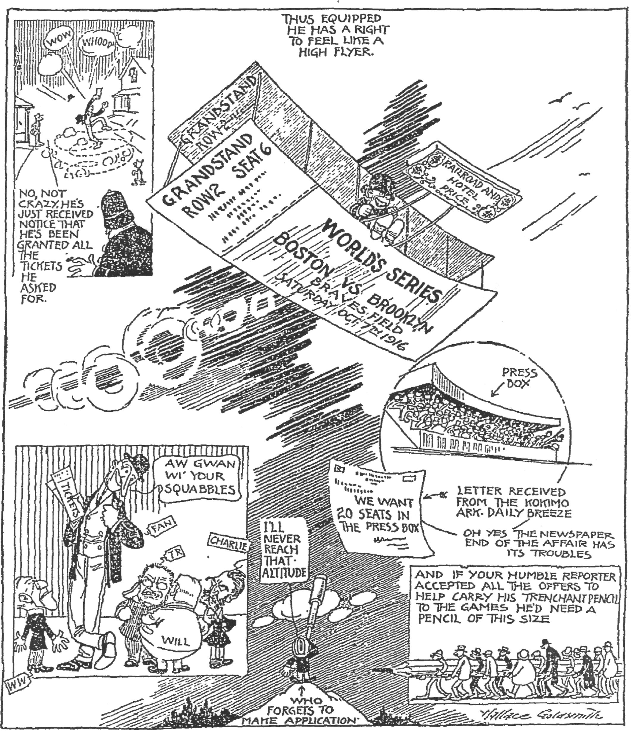 SERIES CHAMPS October 4, 1916 ... The Brooklyn Robins clinched the National League by defeating the New York Giants 9 to 6, while the Phillies were losing two games to the Boston Braves. The Brooklyn victory gave them a 1 1/2 game lead at the finish. After the game President Charles Ebbets announced his retirement from baseball whenever he finds a purchaser of the team. Ebbets has been connected with the team for 34 years as secretary and then president. Royal Rooter president, John Killeen, said that President Ebbets has assured that the Royal Rooters will receive an allotment of tickets for the World Series. It was stated at Fenway Park that the first batch of World Series ticket applicants would hear from the Red Sox management tomorrow. The first World Series games will be played at Braves Field on Saturday and Monday. Not since the 1903 World Series with Pittsburgh, have the opening games been in Boston. Today the Red Sox worked out at Braves Field. Jack Barry worked out at second base in a scrub game between the Regulars and the Yannigans, however it is not likely he will see much action in the Series. |
