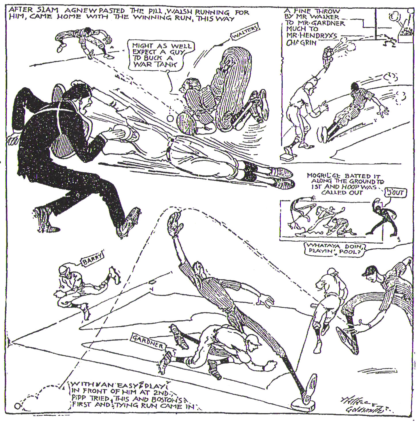 Frank Bakers throw was in time. Harry Hooper then punched one down toward Peckinpaugh, as the New York infield was playing in. Peck handled the ball well and fired it perfectly into Walter's glove, who was blocking the plate, but he dropped the ball as he took his eyes off the throw, to try