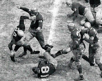 BOSTON'S NFL EAST CHAMPS November 29, 1936 ... Capitalizing on every break handed them, the Skins racked up 227 yards rushing and holding Pittsburgh to a net loss of two. All that is need is a tie with the Giants next week to clinch the divisional championship. Cliff Battles was back in his usual form, running off tackle for consistent gains and running back kicks for 91 total yards. He shared honors with young Vic Carroll, who came in at the end of the first half, when Eddie Kahn reinjured his knee, and turned in a phenomenal performance at guard. He also recovered three fumbles and intercepted a pass for a touchdown. Turk Edwards, not to be out-done, recovered a Pittsburgh fumble in their own end zone for another touchdown. Battles gave Boston the advantage at the outset, returning the opening kickoff 30 yards to his own 48. He picked up the first down to the 38, but Riley Smith missed a field goal to end the threat. John Gildea knocked out a 50 yard punt for the Pirates, but Battles ran it back to the 42, and Riley Smith missed another kick three plays later. After the Pirates could not move, Gildea smashed a 60 yard punt. Pug Rentner then grabbed the handoff on the third play from scrimmage, and wriggled through the secondary, 52 yards to the Pittsburgh 14. Battles picked up the first down to the one in three plays, and finally lunged over the goal line for the first score. Most of the action took place in the Pittsburgh end for the rest of the half, when in the closing minutes, Wayne Milner downed Gildea with a fierce tackle that caused him to fumble. Sam Busich then came into the game a nudged across a three pointer from the 15. Boston kicked off with less than a minute to go in the half and was able to capitalize again, when Vic Carroll picked off a pass at the 35 and sprinted down the sideline for another score. Eddie Britt returned the second half kickoff to the 46. Now the Pirates defense tighten and pushed the Redskins back to the 30 on a fumble and a penalty. Riley Smith punted and Pittsburgh dropped the ball, giving Vic Carroll another fumble recovery. Max Fiske then was able to pick off one of Riley Smith’s passes and ran it back 30 yards to the Boston 40 to turn the tide for the Pirates. But Riley Smith picked off his next pass to squelch the only real Pittsburgh scoring threat. Riley Smith buried Pittsburgh at their own five with a great punt early in the fourth quarter. The Pittsburgh center than snapped the ball to nobody in a mixed up play and Turk Edwards jumped on the ball in the end zone for another Boston score. Eddie Britt intercepted Gildea’s pass in the next series, and ran in down to the Pirate 35. “Bull” Irwin making his debut for Boston threw an interception down the middle but redeemed himself by knocking the ball out of Stroot’s hands and recovered it at the 14 yard line. On the next play, “Bull” romped through a wide hole and posted the final Boston score. |