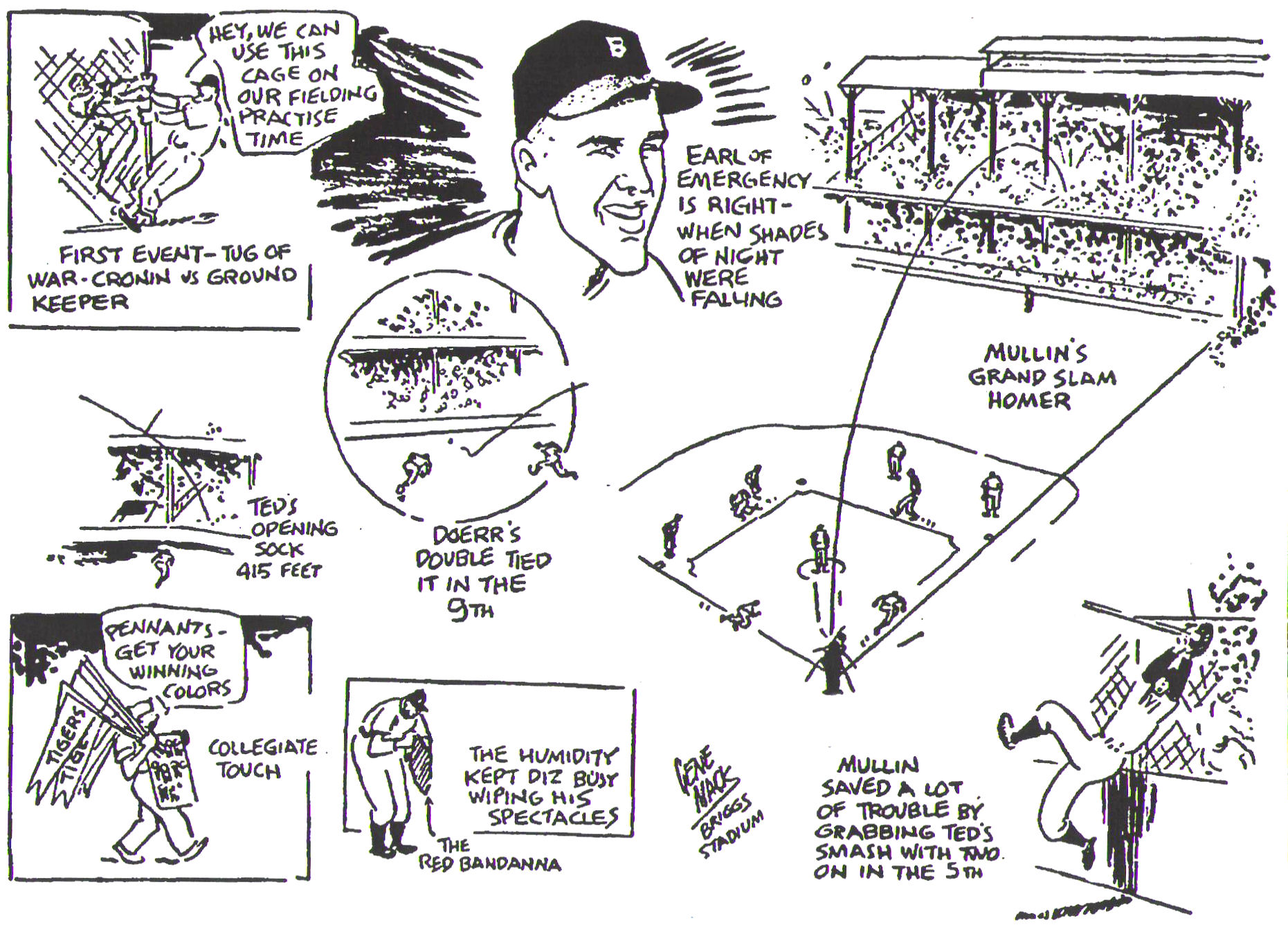 Doerr lined Dizzy's payoff pitch over Wakefield's head in left center for a 365 foot double and allowed Ted to score from first base with the tying run. DiMaggio ended the inning with a foul pop to Hank Greenberg at first. Earl Johnson came in in the ninth inning and Eddie Lake singled with