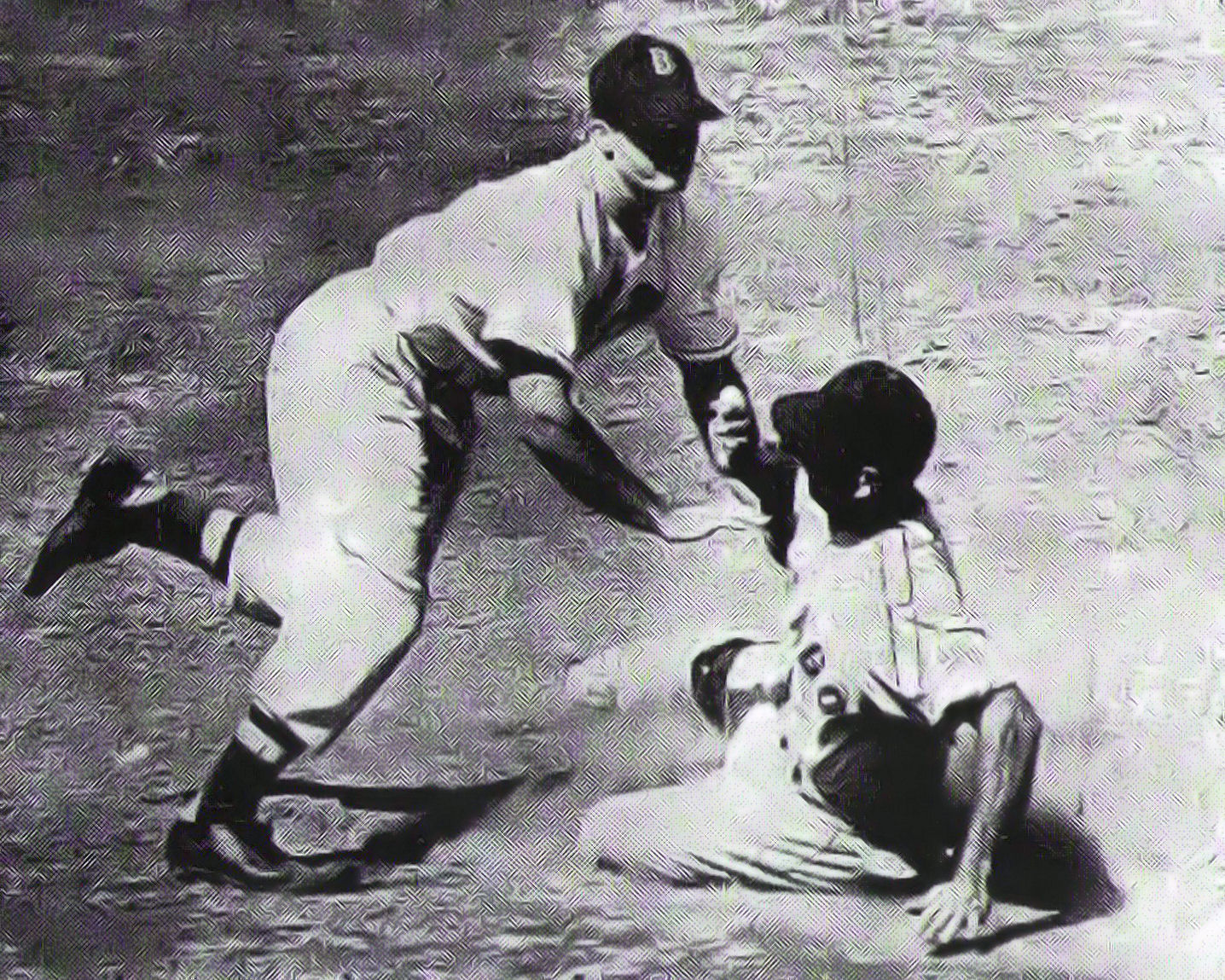coffin corner to bring in McBride. Next, Ted Williams lifted what should have been an easy fly ball to right, but Thurman Tucker lost it in the sun and let it drop a foot from him, allowing DiMaggio in with the third and final run.