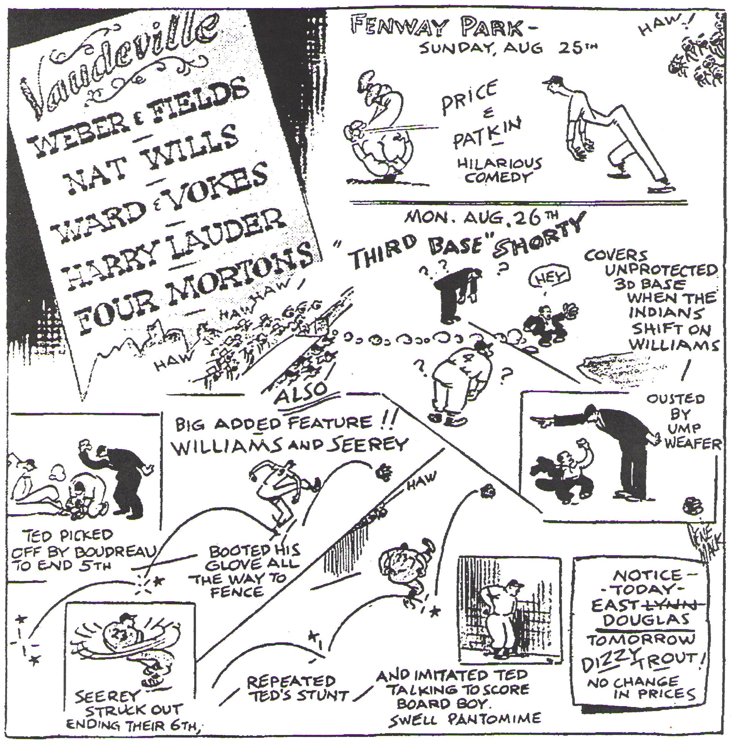 The latest comic relief made by the Indians occurred when Ted Williams went to bat and the Indians moved into their shift, leaving Pat Seerey in short left field to the left of second base. Suddenly from out of the box the just beyond the Cleveland dugout, darted a small figure. He streaked