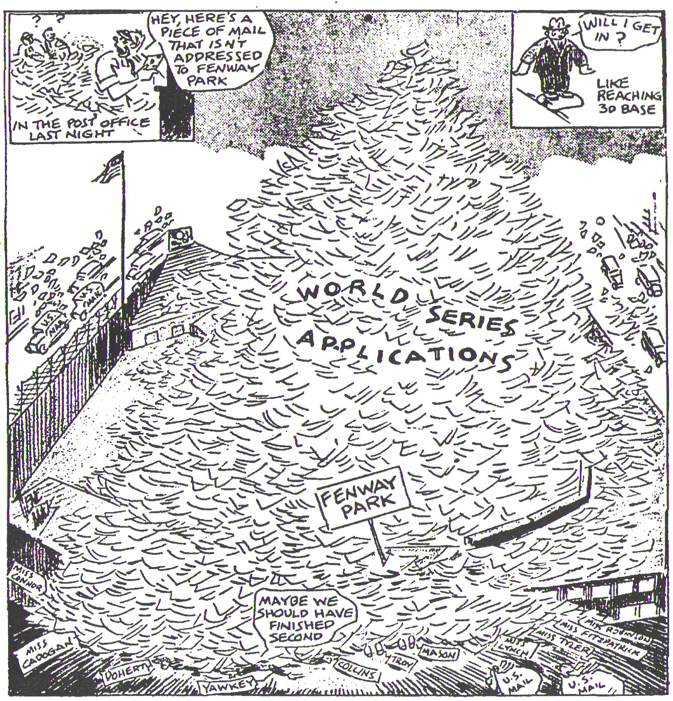 THE CURSE OF THE BAMBINO, PART 2 ... September 9, 1946 ... No game scheduled ... Thousands of baseball fans poured into Boston from all over New England to enter the mad race for World Series tickets at the midnight zero hour. Avid ticket seekers stood in long lines at the main post office, the South Postal Annex, and it all Western Union offices in the city. Traffic jams of major proportions develop throughout downtown Boston as fans from distant points, as well as those in Boston, walk for a minute's head start starting applications to the Red Sox ticket office. Western Union said it expected to handle 10,000 money order transactions before 8 AM. Postal money orders during the day, numbered between 7000 and 10,000 purchased. At 11 PM the post office was forced to open extra windows to handle the increasing crowds. The crowd increased at the federal building, until automobiles were strung all the way to the top of Beacon Hill, waiting their turn to proceed to Post Office Square. Red Sox owner, Tom Yawkey, arrived in Detroit this morning and wishes to throw a personal party for his players the night they clinched the pennant. Neither Ted Williams nor Bobby Doerr went fishing today as planned. They had plans with some personal friends who are unable to make it. |