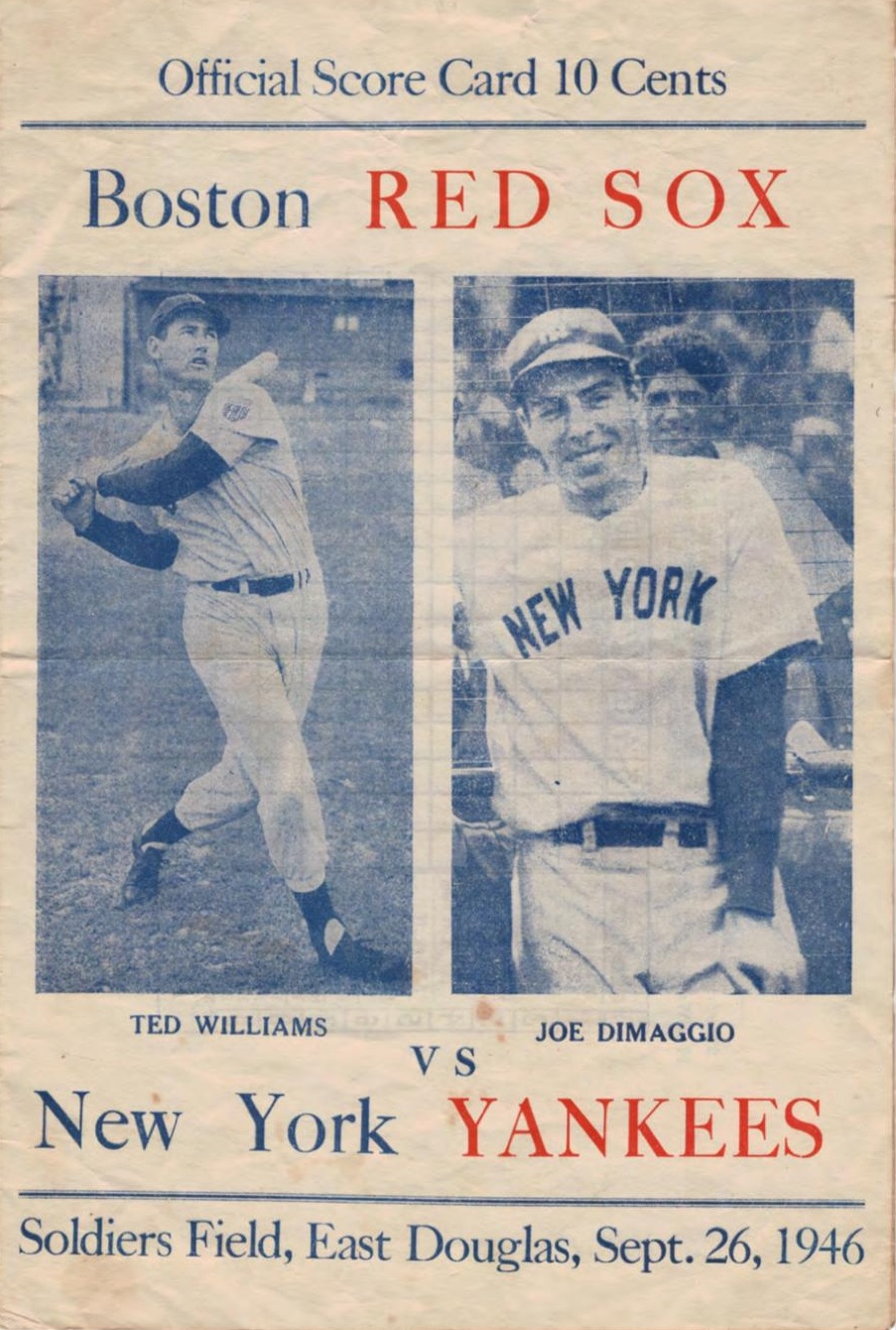 THE CURSE OF THE BAMBINO, PART 2 ... September 26, 1946 ... No game scheduled ... In a day of gift giving, the Yankees outslugged the Red Sox, 8-7 in an exhibition game in East Douglas. In front of 12,000 fans, nearly quadruple the local population, at Soldiers Field, the teams had been brought in by woolen mill magnate Winfield A. Schuster, of the Hayward-Schuster mills, as a welcome home for the troops returning from World War II and as a celebration of the town's bicentennial anniversary. Joe Cronin was given a car, while the players were given jackets. Umpire Bill Summers from nearby Uxbridge, received a new washing machine, while Joe DiMaggio, Joe Gordon, Bobby Doerr and Ted Williams were given hunting rifles. After Ted Williams had batted twice, he went up to the broadcast booth and called the fourth inning. During his tenure at the mike, the Sox scored five runs. Douglas resident, Ann Resan recounted a story about her friend Dolores Colonero, who lived next to the baseball field and whose father wanted to offer Yankees' centerfielder Joe DiMaggio a glass of wine as a form of good Italian hospitality. She said DiMaggio told her father, “Oh no, Mr. Colonero, I don't drink when I play.”