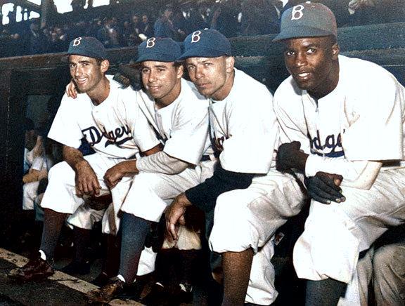 Jackie Robinson breaks baseball's color barrier April 15, 1947 ... The Dodgers opened the season today at Ebbets Field against the Boston Braves. Rumors of a sellout may have discouraged some fans from attending, but whatever the reason, a crowd of only 26,623 saw the opening game of the 1947 season. Rookie Jackie Robinson made the game’s first putout, receiving the throw from fellow rookie Spider Jorgensen on Dick Culler’s ground ball to third base. Interim manager Clyde Sukeforth had Robinson batting second, so after Eddie Stanky grounded out, Jackie stepped in against the Braves' Johnny Sain for his first major league at-bat. Sain, the National League’s winningest right-hander in 1946, retired him easily on a bouncer to third baseman Bob Elliott. After flying out to left fielder Danny Litwhiler in the third inning, Robinson appeared to have gotten his first big league hit in the fifth. But, shortstop Culler made an outstanding play on his ground ball and turned it into a well-executed 6-4-3 double play. The Dodgers were the first to score, getting one run in the fourth inning. Pete Reiser, who had walked with none out, scored when Gene Hermanski threw a block on secondbaseman Connie Ryan, who was trying to turn the double-play on Bruce Edwards' ground ball to Bob Elliott. The Braves retrieved the run in the fifth inning, when Ryan opened with the first of his three singles. Johnny Hopp drove him in with a single to left, to tie the game at 1 to 1. In the sixth inning the Braves scored two runs when Joe Hatten hit Litwhiler to start the inning. Braves' rookie, Earl Torgeson bunted, but Edwards threw wild to second base. Phil Masi sacrificed them ahead and Ryan came through with a single to score Litwhiler and Torgeson and give the Braves a 3 to 1 lead. The Dodgers scored a run in their sixth when Reiser opened with a bunt for a base hit. Dixie Walker followed with a clean single and Spider Jorgenson scored Reiser on a ground out, to make it 3 to 2. Eddie Stanky was the first to bat in the seventh inning, and opened by drawing Sain’s fifth walk of the afternoon. It was an obvious bunt situation and Robinson laid down a beauty, pushing the ball deftly up the right side. toward first baseman, Torgeson, who fielded it, but with Robinson speeding down the line, was forced to hurry his throw. The ball hit Jackie and caromed away, allowing him to take second and Stanky to reach third.