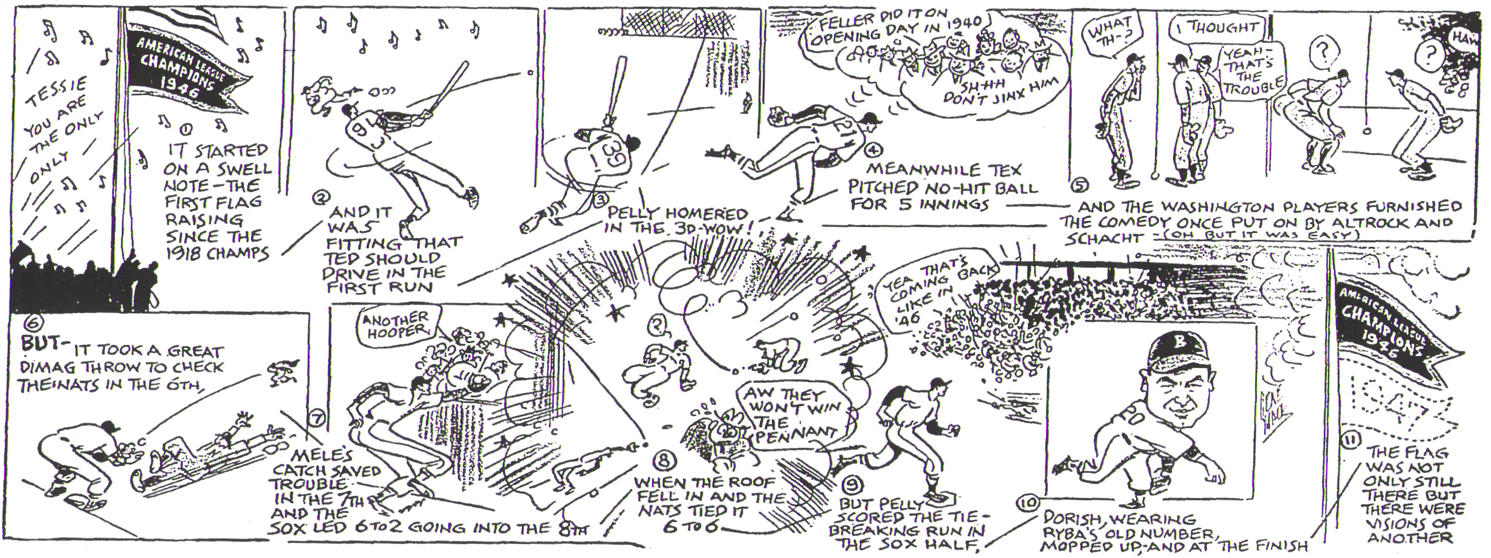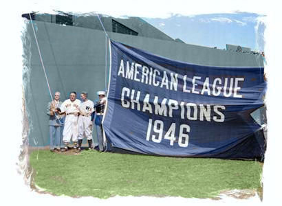 But the Sox stormed back with a three run assault in the bottom of their half of the seventh. Pesky and DiMaggio opened with singles. Ted Williams grounded out as Pesky scored. Bobby Doerr drew a walk and Rudy York hit one that got thru between the legs of thirdbaseman Cecil Travis to score Dom. A walk to Mele and Hal Wagner's grounder brought in Doerr to make the score 6 to 2. The faltering Hughson came out of the game in the eighth-inning. Evans and pitcher Early Wynn started it off with a pair of singles. Grace hit a hard grounder down to Pesky starting a double-play and it looked like Tex might be out of the woods. But he passed Lewis and Spence to fill the bases. Mickey Vernon followed with a double high off the left-field fence, to bring in two runs and that was the afternoon for Mr. Hughson. Johnson came in but was wild, walking Travis on four pitches. He tossed two more to Priddy, before Dorish was rushed in to his rescue. Ted Williams had a free day on the bases. He was retired at first base, second base, third base and at home although he had two hits in four official at-bats. Before the game, Governor Bradford tossed out the ceremonial first pitch to launch the 1947 campaign. American League President William Harridge participated in the raising of the 1946 American League, along with manager Joe Cronin. Then followed the raising of the American flag by a detail of local Marines that served in the Pacific. |