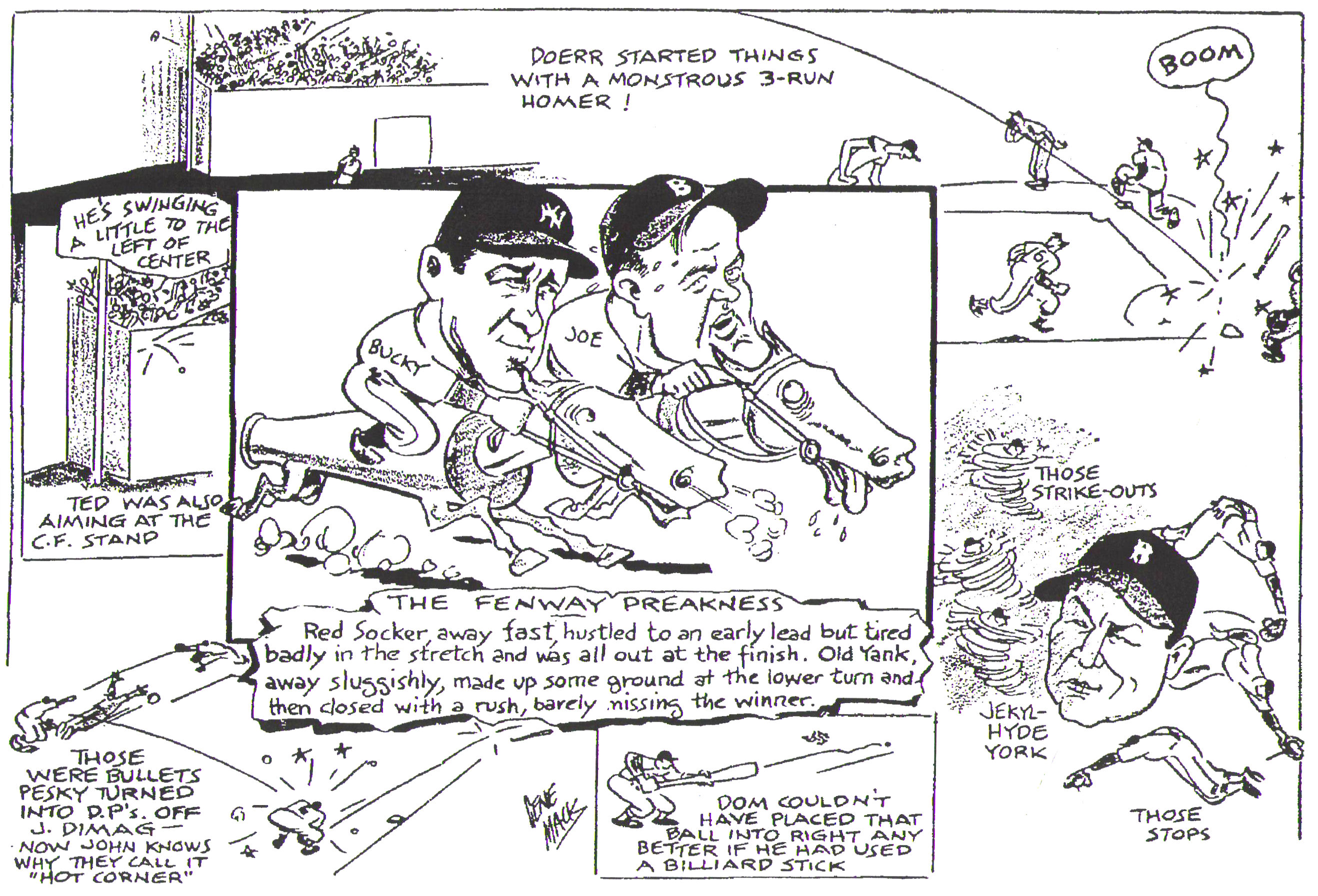 Red Sox starter Tommy Fine, who watched his teammates produce a six run inning, could not stand the prosperity and soon trudged off to the showers, after passing the first three Yankee batters in the second inning. And so it happened that Harry Dorish took up the burden to avert serious