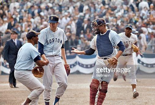 THE CURSE OF THE BAMBINO, PART 6 ... October 9, 1967 ... Jim Lonborg has clearly been the key to the Red Sox success. Two weeks ago when the Twins were about to bury the Red Sox, Lonborg beat them and moved his team into the World Series. Then he went out and beat the Cardinals and flirted with a no-hitter. Today, with a elimination on the line, Lonborg beat St. Louis in front of a packed house at Busch Stadium, 3 to 1. He allowed only three hits and the Cardinals couldn't get a man to third base until the last inning, when Roger Maris stung one of his pitches into the right-field seats for a home run with two outs. And so the Red Sox come home to Fenway Park. The Cardinals brought out southpaw Steve Carlton to face the Red Sox. He had good speed and a great curve, by his defense cracked on him today in the third inning. Joe Foy was back at third-base and in the third inning lined a single to left field with one out. Mike Andrews tried to bunt him over and Carlton was slow moving after the ball as it rolled down the third-base line. He obscured third baseman Mike Shannon's vision, and when Shannon finally got to the ball he bobbled it for an error. After Carl Yastrzemski took a called third strike and muttered at umpire Ed Runge, Ken Harrelson slammed a ground ball into the hole between third and short for a base hit that scored Foy with the first run. George Scott flew out to right to end the inning. Lonborg kept the Cardinals' batters at bay throughout the game and in the seventh inning saw his team get another chance to score. Ray Washburn was now on the mound for St. Louis and Yastrzemski lined a double to left. But then Ken Harrelson grounded out to end the threat. Leading 1 to 0, in the ninth-inning, the Red Sox got an additional two runs to help their pitcher. It started off when Ron Willis, who had come in when Washburn was lifted for a pinch-hitter, walked George Scott. Reggie Smith lined a double down the left-field line and the bases were loaded when Rico Petrocelli was given an intentional walk. After Willis threw one ball to Elston Howard, Jack Lamabe came in to pitch for the Cardinals. Howard blooped a single to right that scored both Scott and Smith. The ball landed about a yard in front of the Maris and Roger threw to the plate as Scott ducked under McCarver's leap. The ball bounced off the catcher's glove and rolled about 5 feet to his left. While McCarver reached for the ball, Reggie slid in for the second run of the inning.