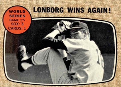 With Petrocelli on third Lonborg tried to bunt on the third strike and fouled it off. Then Joe Foy struck out as Howard and Petrocelli were working a double steal. McCarver threw down to Javier, who cut the throw and threw to Shannon at third, who threw out Rico at the plate. In the bottom of the ninth Lonborg got the first two men out and his teammates were at the top step of the dugout waiting to mob their pitcher. Maris had other ideas and lined Lonborg's pitch over the right-field fence. Cepeda grounded out to end the game and the Red Sox players came out to congratulate Lonborg on his second World Series win. His effort established a record for the fewest hits allowed in two consecutive World Series starts. For Red Sox fans, the format is familiar. The Red Sox have to win the last two games at Fenway Park to establish themselves as the most miracle team since the 1914 Boston Braves. |
